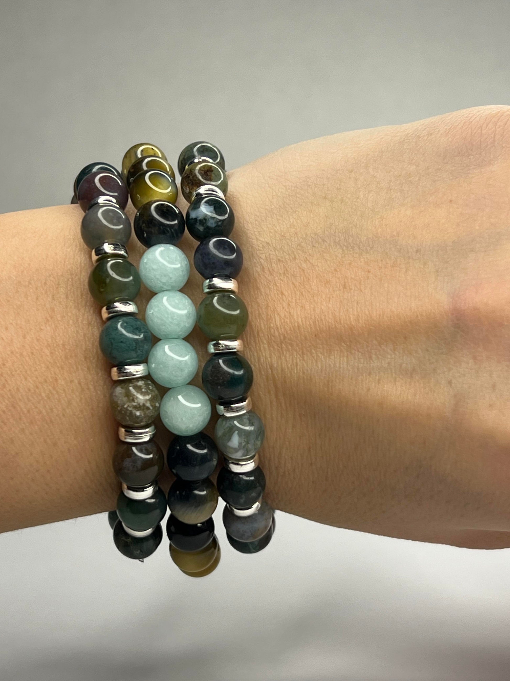 Combining Tiger Eye with Turquoise Quartz creates a vibrant and meaningful piece. Tiger Eye, with its golden to brown hues and silky luster, symbolizes courage and protection. Turquoise, known for its blue-green colors, represents healing and tranquility. This mix offers a striking balance of energy and color, signifying strength and serenity.