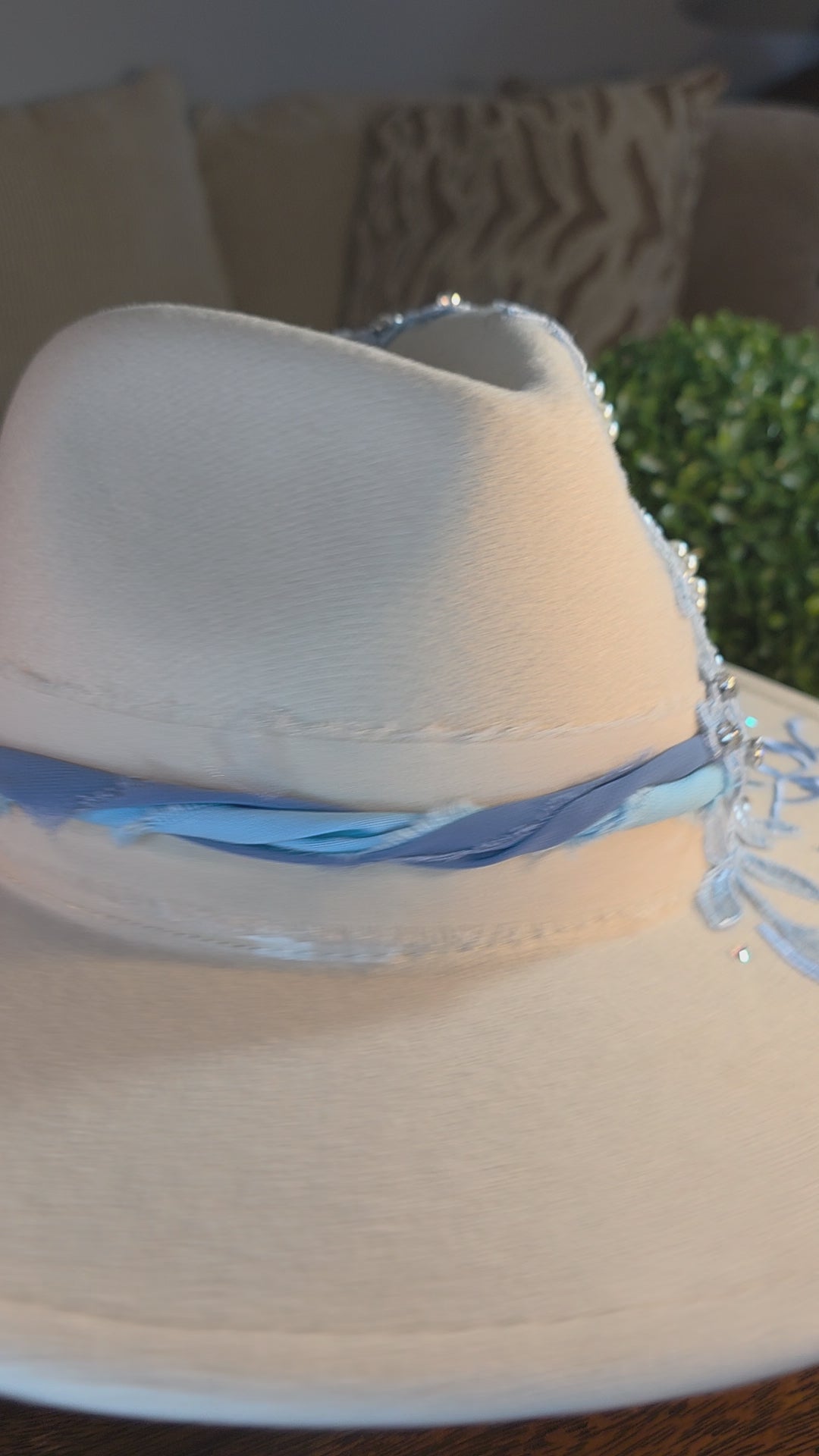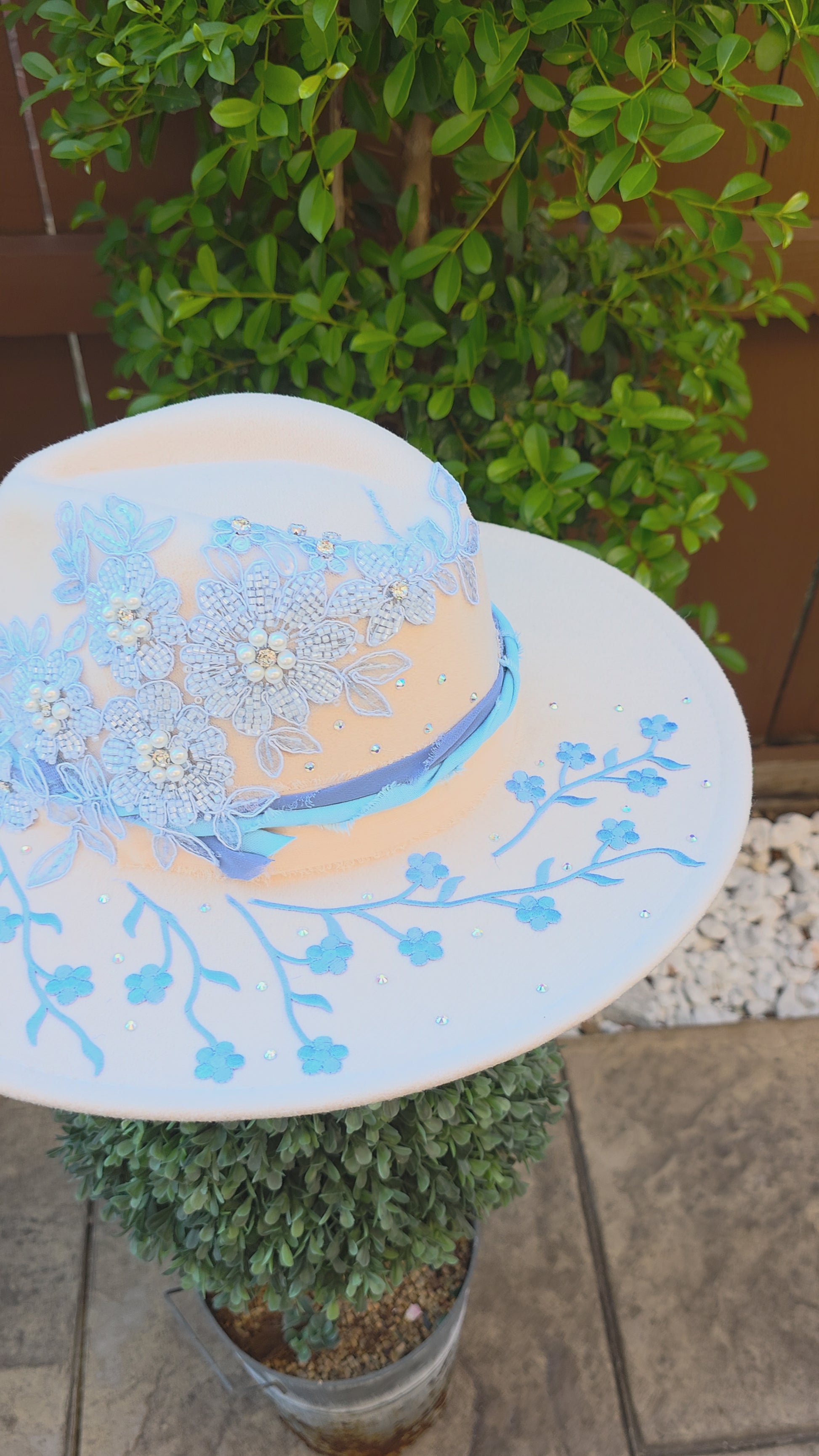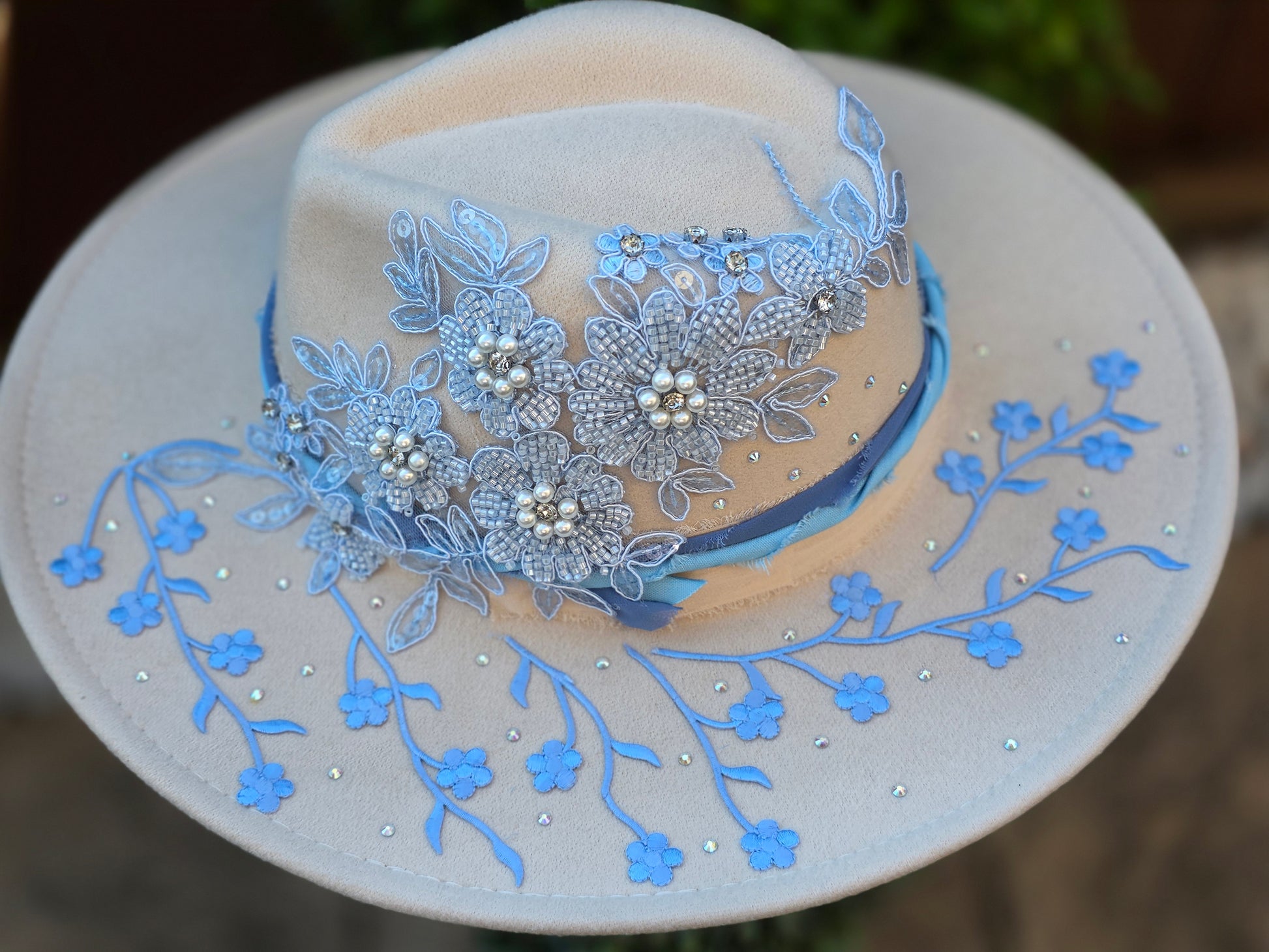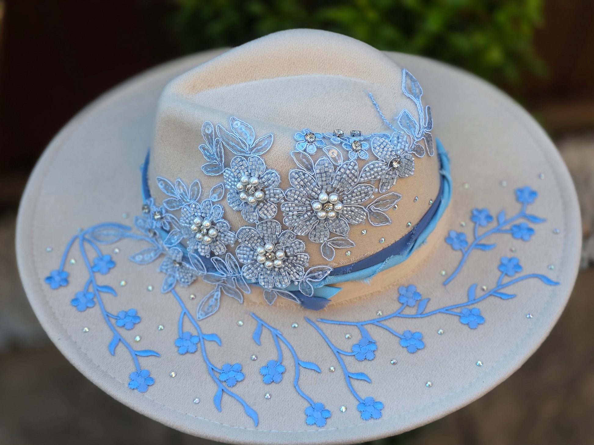 Each hat is hand-decorated to perfection, balancing soft neutrals with serene blue tones. The intricate floral lace, pearl centers, and beaded embellishments create a captivating interplay of texture and light. A silk blue ribbon encircles the crown, adding depth, contrast, and an air of understated glamour.