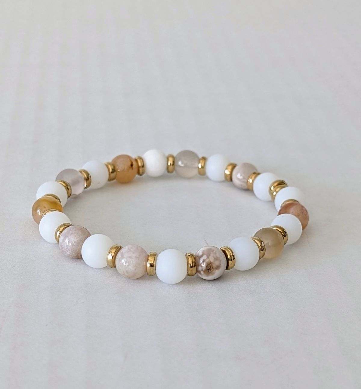 The combination of these elements results in a bracelet that is not just visually striking but also full of meaningful symbolism. Moonstone and Citrine offer emotional balance and prosperity, Picture Jasper provides grounding and comfort, and Gold enhances the energetic properties of the stones and adds a touch of elegance. This bracelet can serve as a powerful personal talisman, supporting emotional well-being, grounding, prosperity, and spiritual growth, or as a thoughtful and meaningful gift.