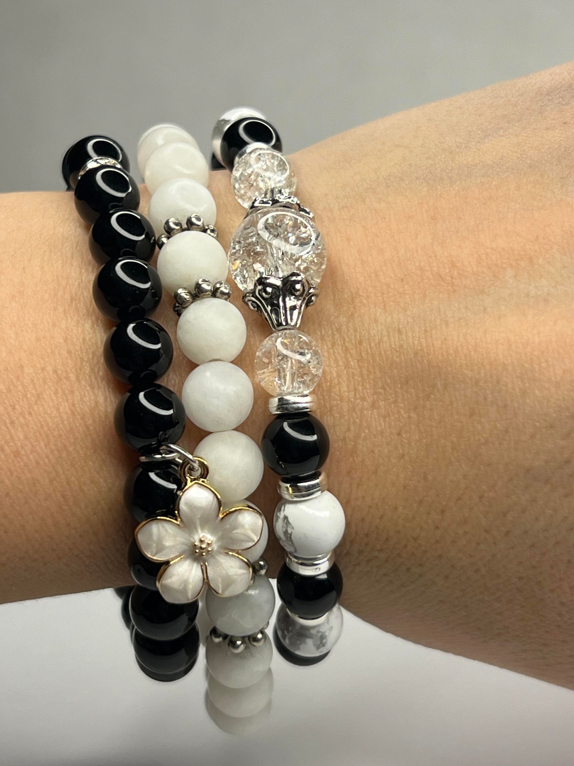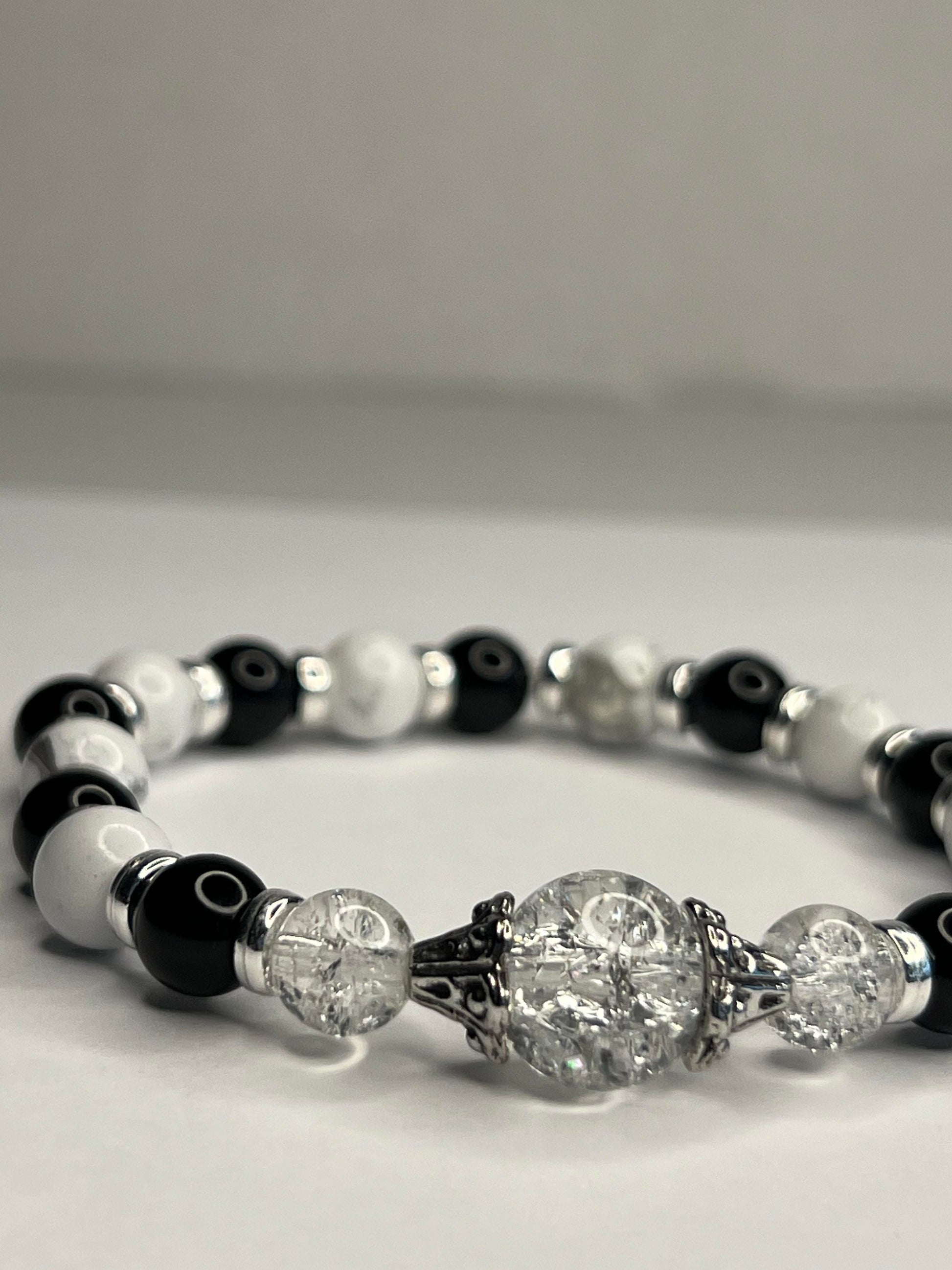 Integrating Howlite with Pure Crystals, Black Onyx, and Steel creates a refined and energetically balanced jewelry piece. Howlite, known for its calming properties and ability to promote awareness and patience, pairs beautifully with the clarity and amplification qualities of Pure Crystals. Black Onyx adds a layer of protective energy and strength, grounding the piece with its powerful vibration. The inclusion of Steel frames these gemstones in a modern, durable setting, enhancing the overall aesthetic with a sleek and contemporary edge. This combination not only offers a visually striking contrast but also embodies a harmonious blend of tranquility, clarity, protection, and resilience. It's an ideal choice for those seeking a piece that supports emotional balance and spiritual growth, complemented by the timeless elegance of steel.