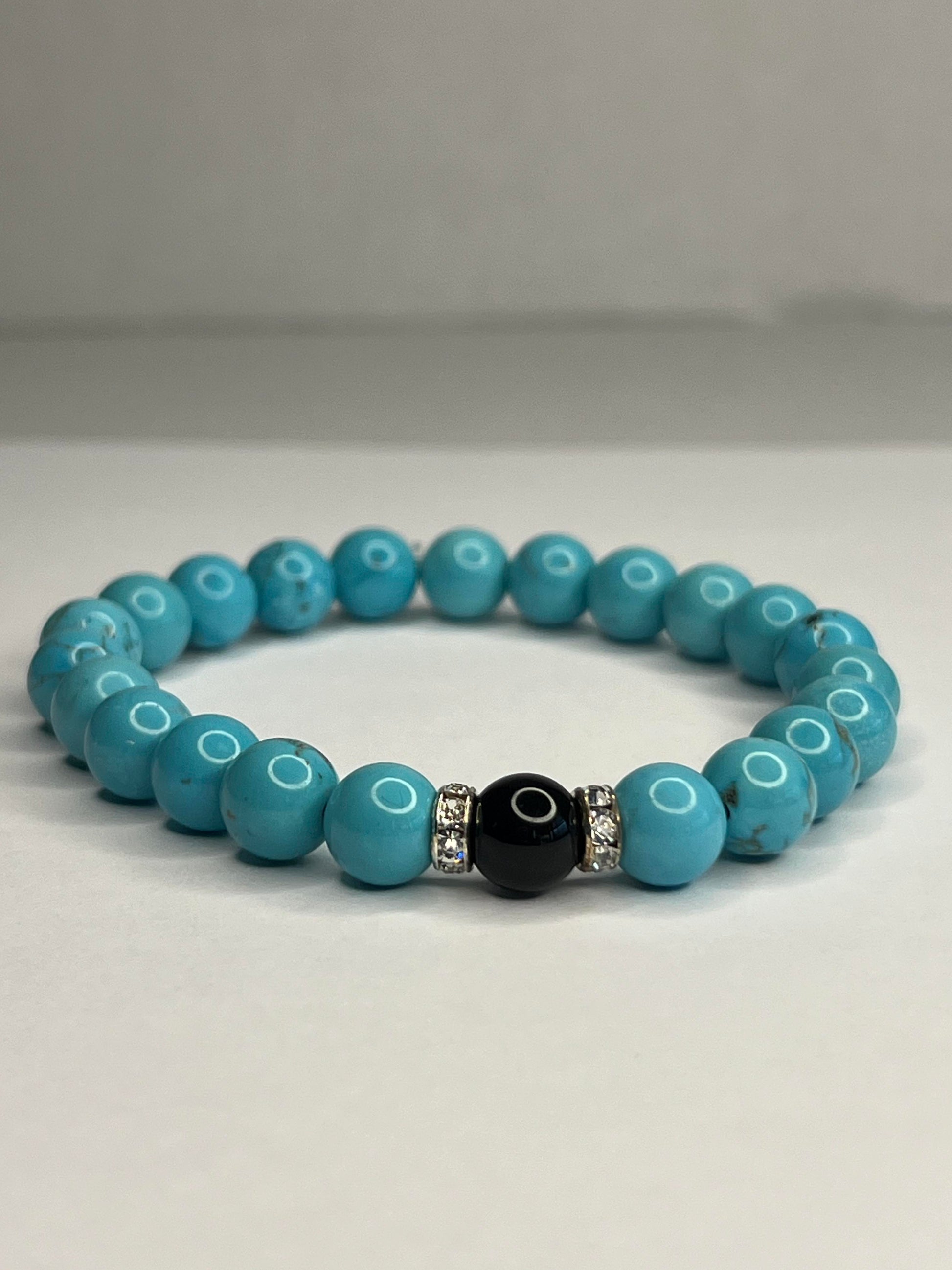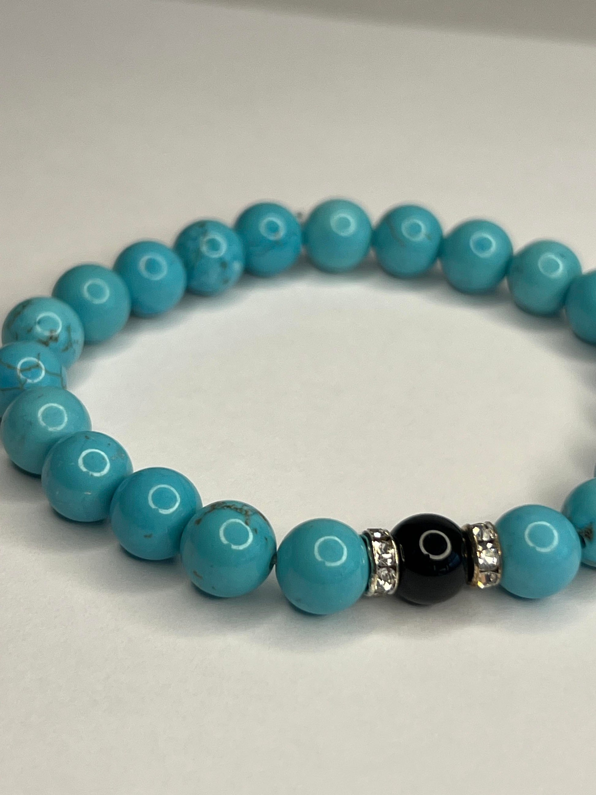 Black Onyx: A powerful protection stone, Black Onyx absorbs and transforms negative energy, and helps to prevent the drain of personal energy. Its deep black color offers a striking contrast to the Marble Turquoise, creating an eye-catching combination. Onyx is also believed to help develop emotional and physical strength and stamina, especially when support is needed during times of stress, confusion, or grief.