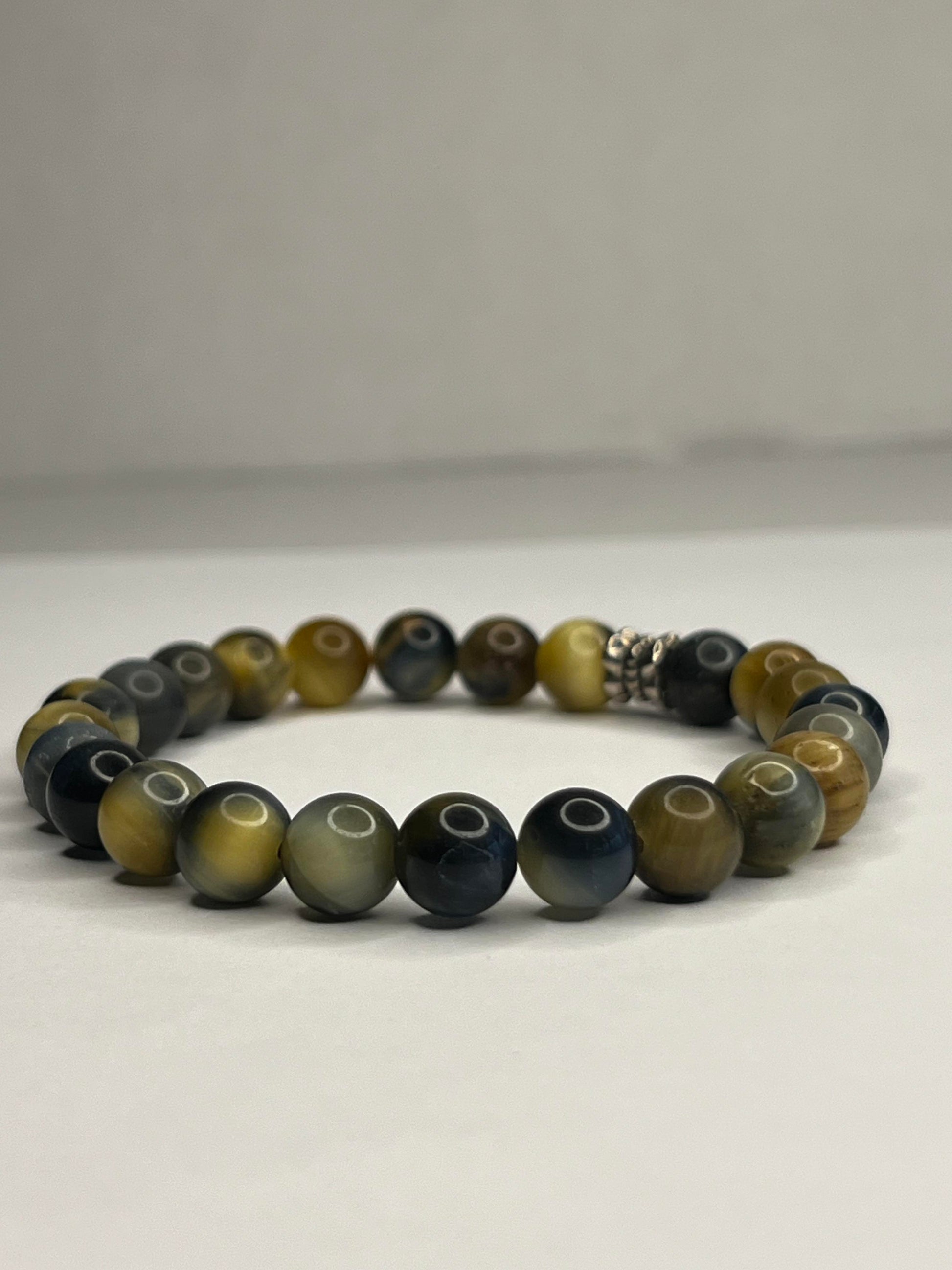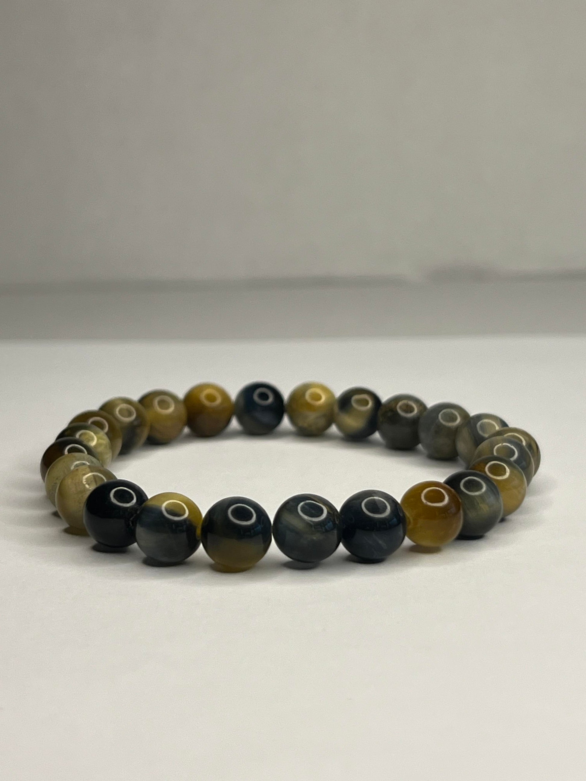 Combining Yellow Tiger Eye with Golden and Black Obsidian creates a striking and powerful accessory. Yellow Tiger Eye, known for its motivational and confidence-boosting properties, pairs beautifully with Golden Obsidian, which is believed to provide insight and balance, and Black Obsidian, renowned for its protective and grounding qualities. This blend of gemstones offers a mix of strength, protection, and mental clarity, making it an ideal choice for those seeking a piece that is both visually stunning and rich in symbolic energy.