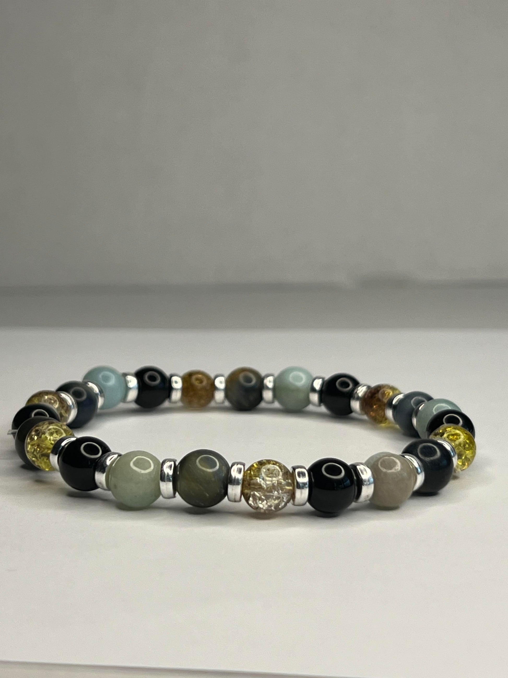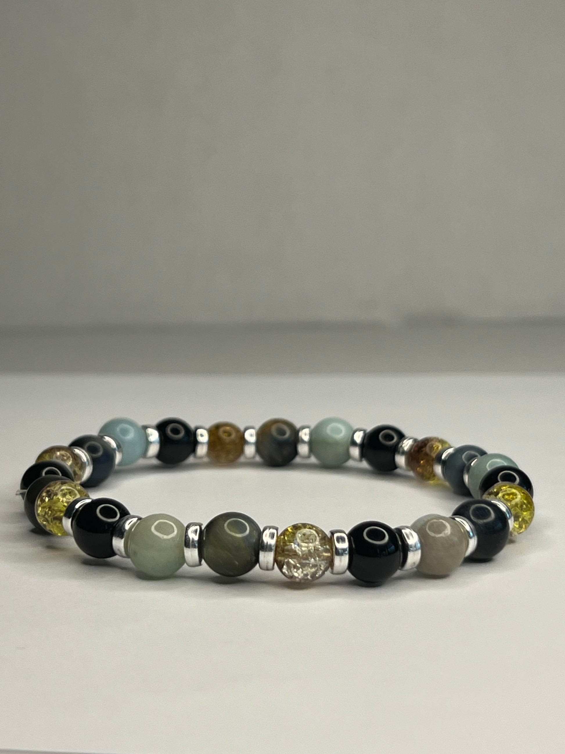 Uniting Citrine with Labradorite, Onyx, and steel creates an accessory that is both visually striking and energetically powerful. Citrine, known for its properties of joy, abundance, and positivity, complements the transformative and protective qualities of Labradorite. Onyx adds an element of strength, grounding, and endurance. The incorporation of steel not only brings a modern, durable aspect to the piece but also symbolizes resilience and fortitude. This combination offers a harmonious blend of uplifting, protective, and grounding energies, making it an ideal choice for those seeking balance and empowerment in their lives.