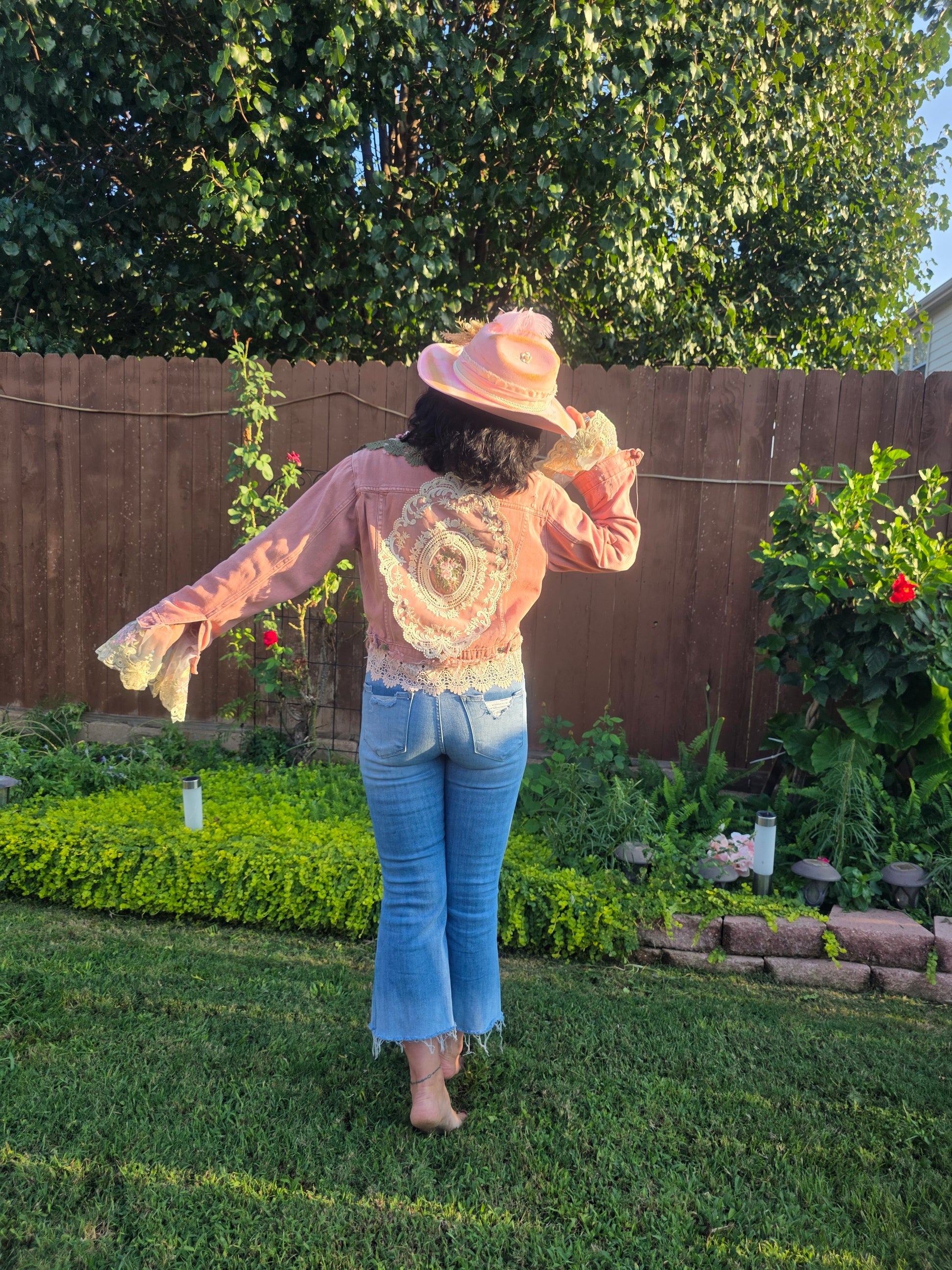 Features: - Soft dusk pink denim with a flattering cropped silhouette - Ornate lace appliqué on the back panel, framed like a Victorian cameo - Flared cuffs layered with embroidered tulle and scalloped lace for dramatic flair - Green lace collar accented with tiny pink florals for a garden-inspired touch - Pearl-like beads and floral trims on pockets, hem, and sleeves - Distressed details for a hint of boho edge - Flair Brim signature label stitched with care