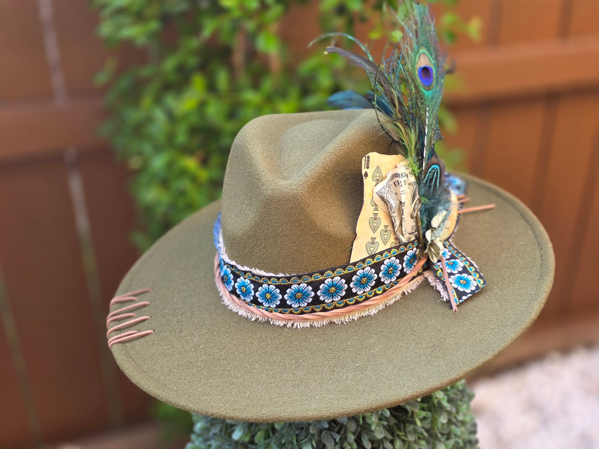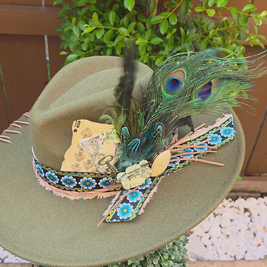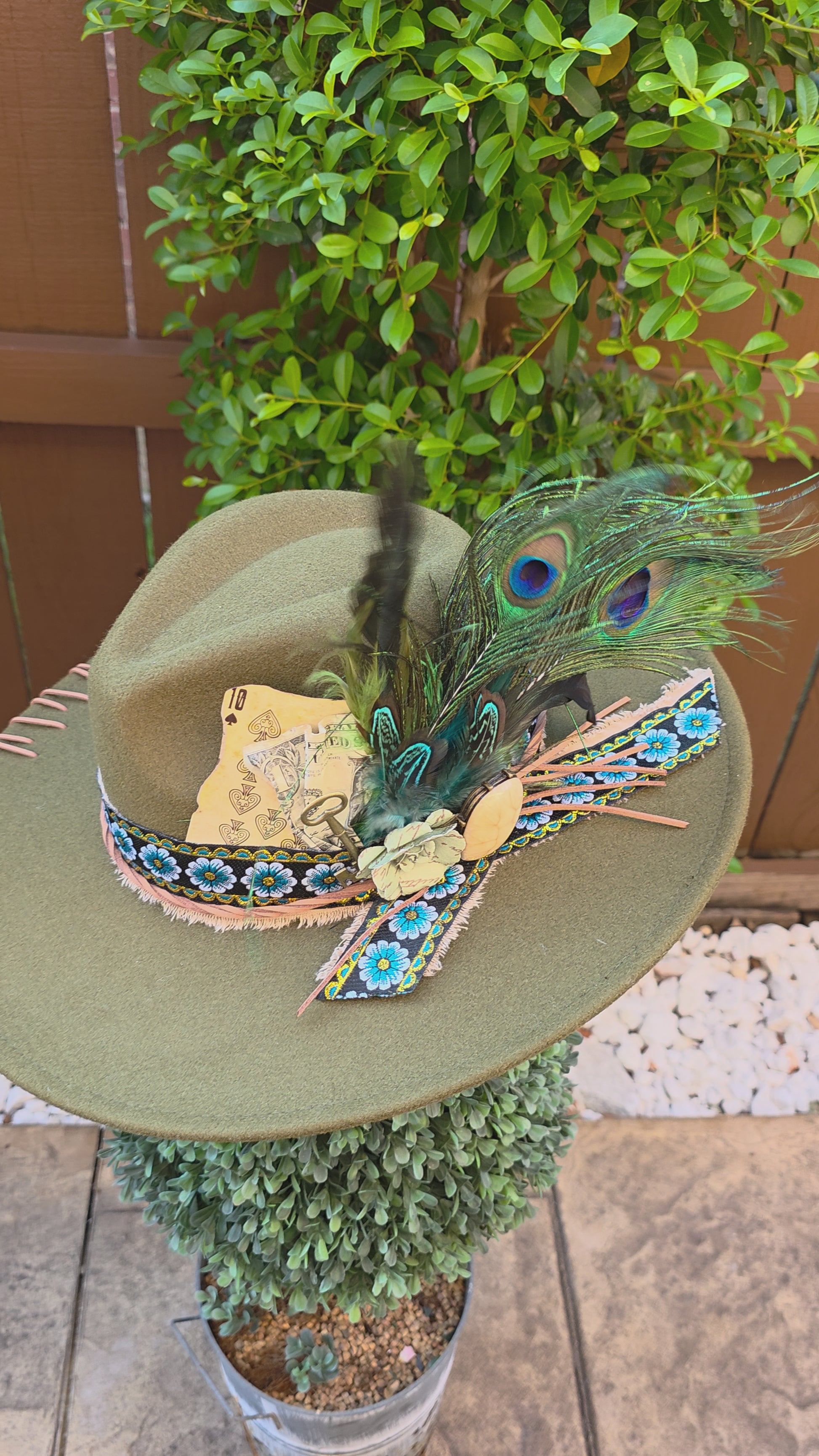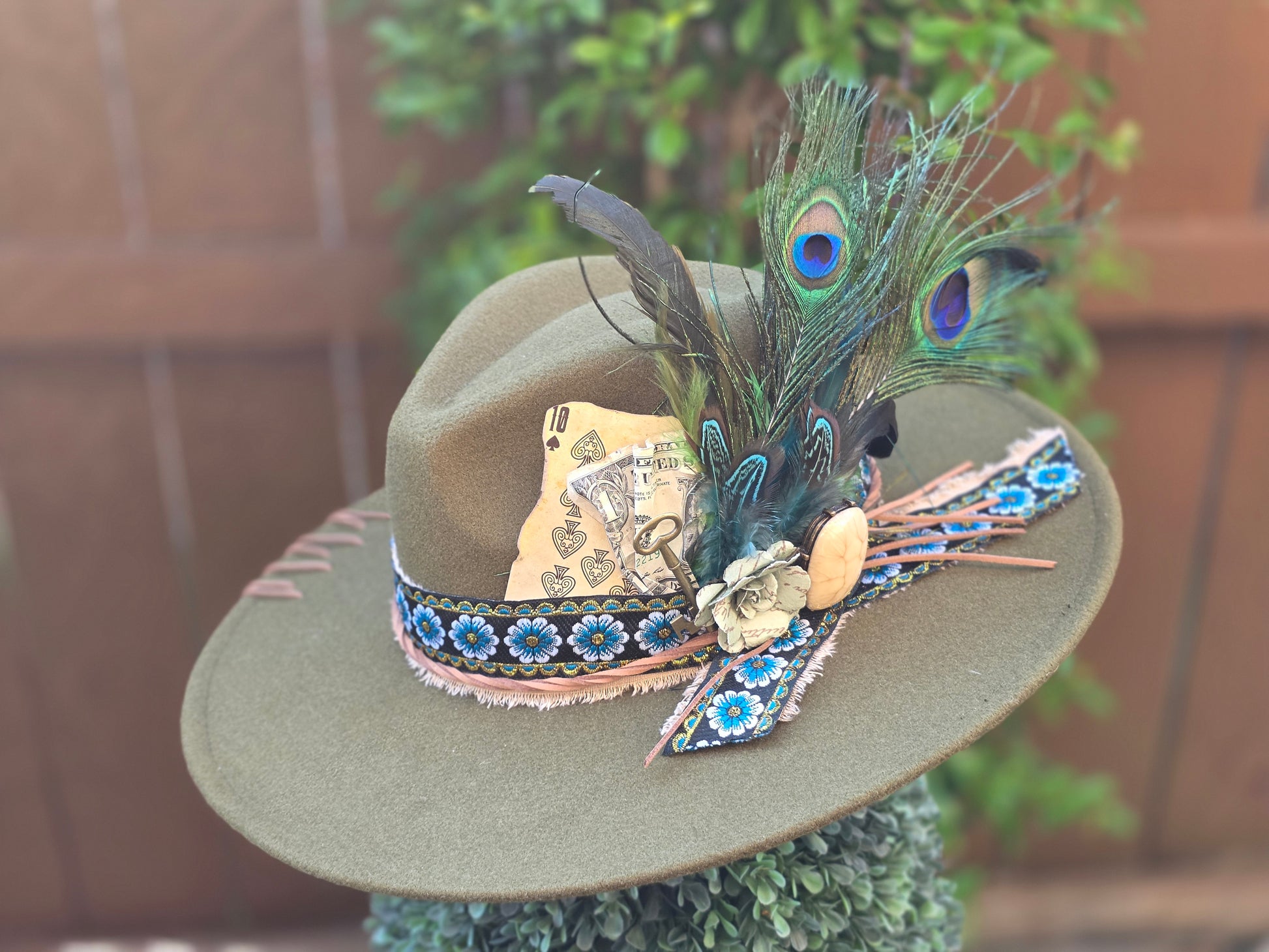 Keywords: olive green fedora, handmade boho hat, peacock feather fedora, artistic statement hat, women’s fashion accessories, bohemian fedora, unique handmade hat, festival style, Flair & Brim.