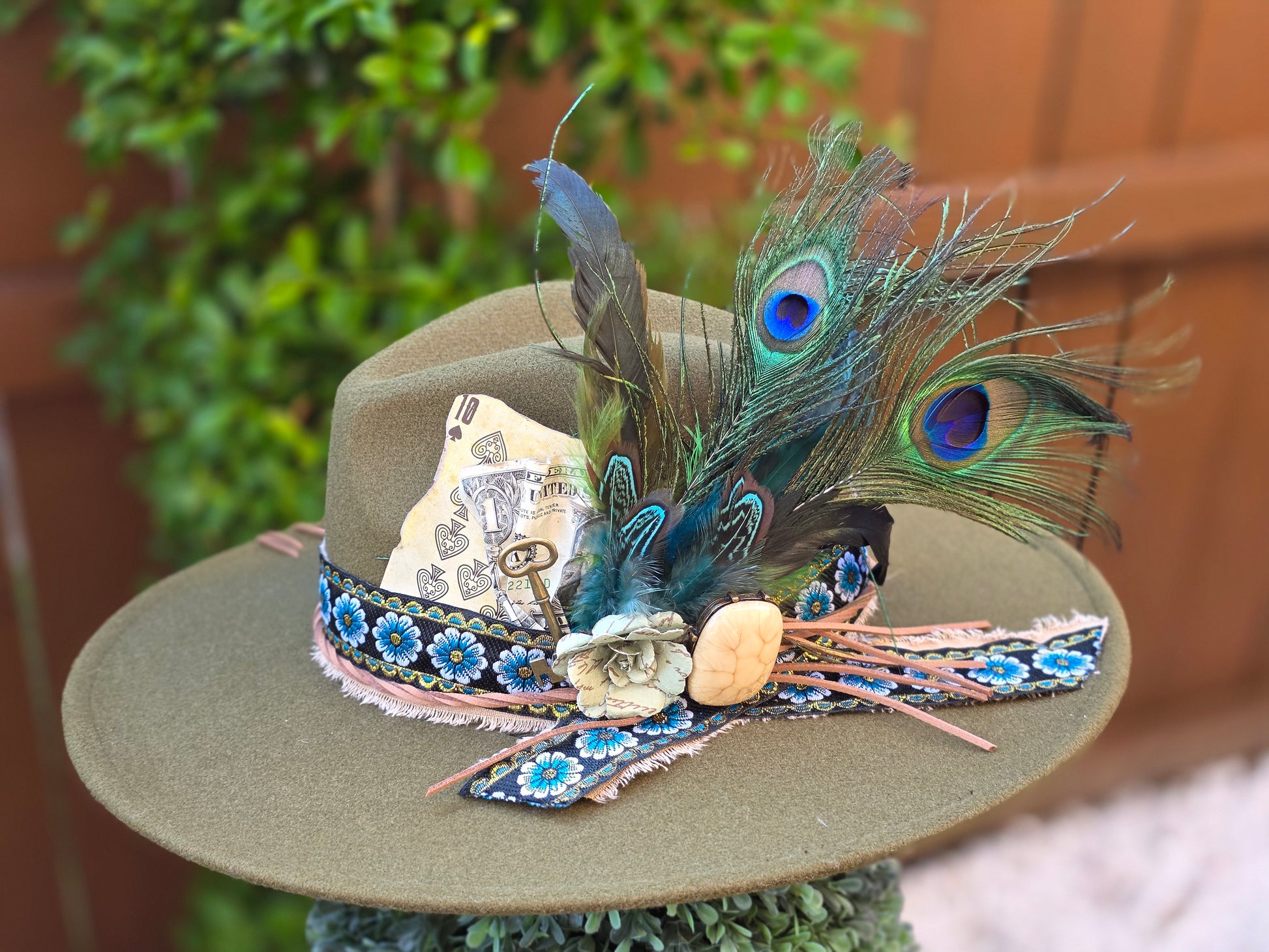 The soft felt base is wrapped in a vintage blue floral ribbon and finished with a hint of pink fringe, blending soft femininity with rustic edge. Two iridescent peacock feathers rise gracefully from the crown — symbols of beauty and vision — while vintage playing card cutouts, a tiny key, and mixed embellishments add mystery and charm.