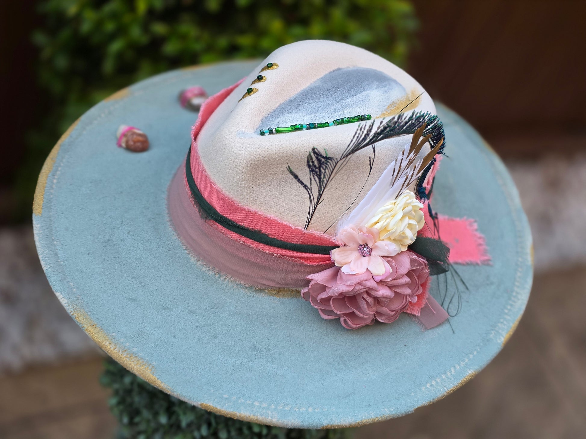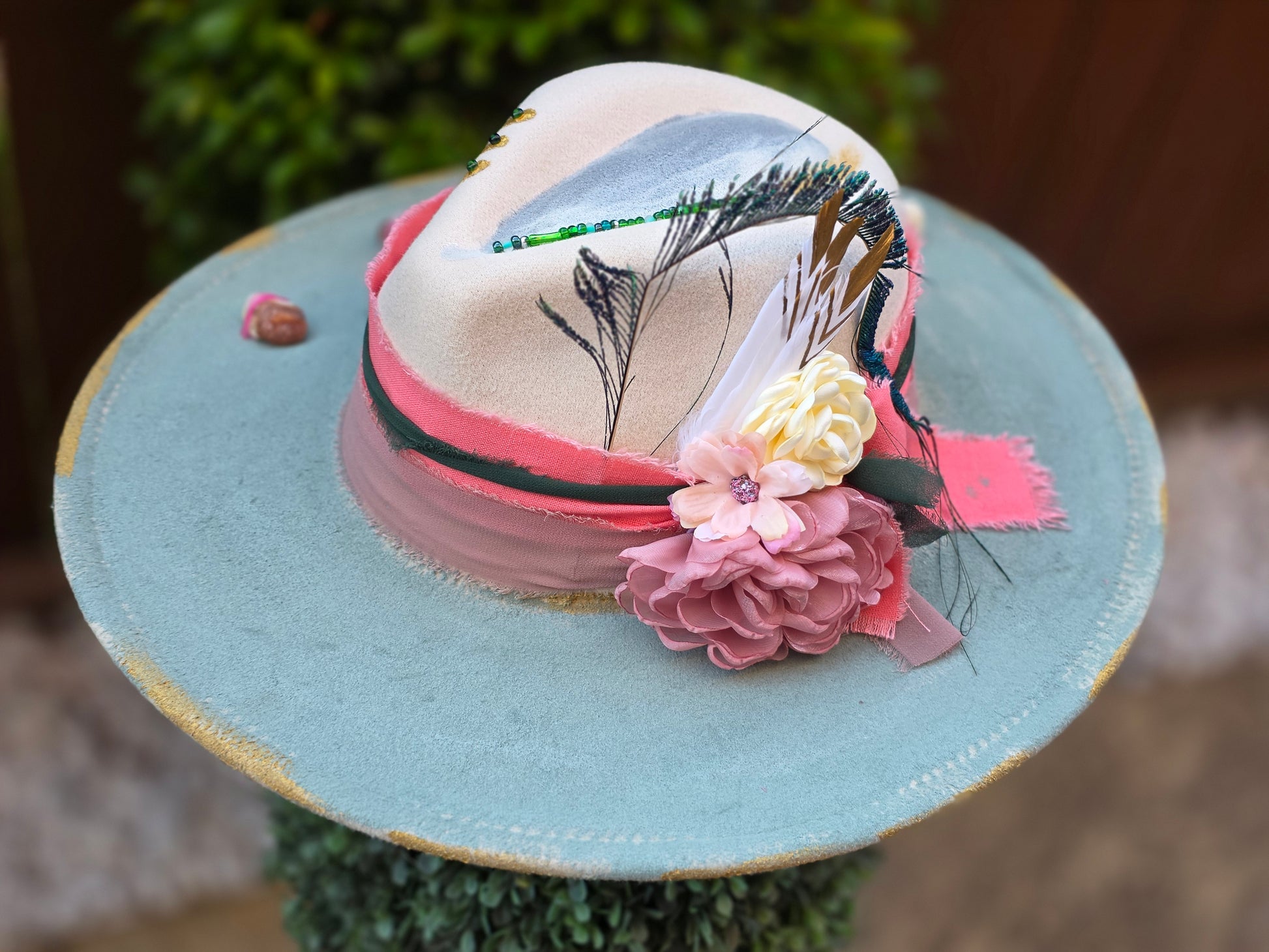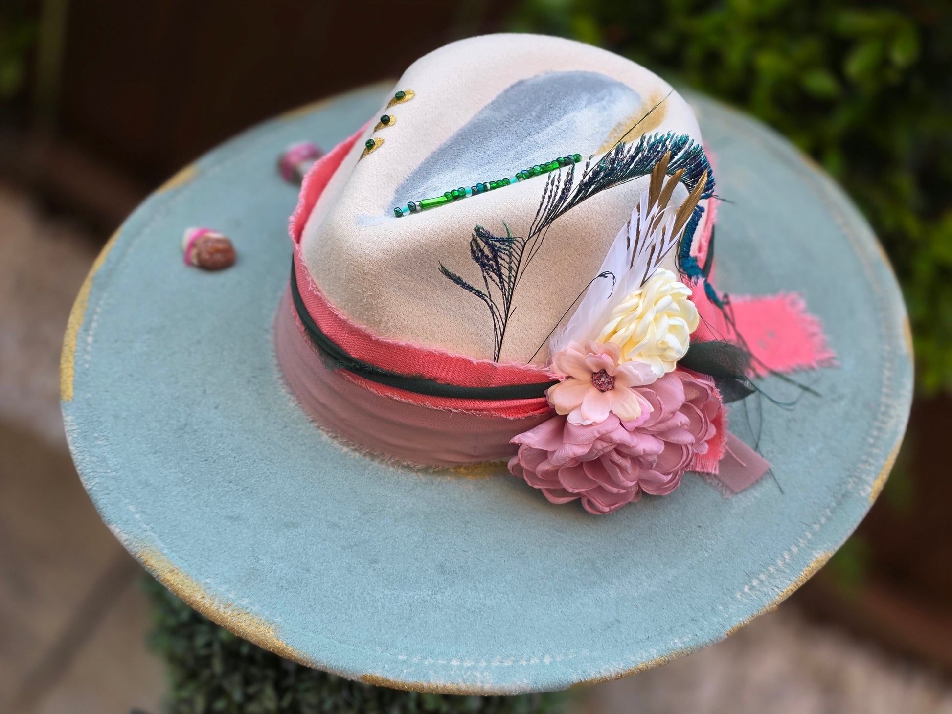 Hashtags: #HandmadeHat #ArtisticFedora #ImpressionistHat #WhimsicalStyle #FlairAndBrim #WearableArt #FestivalFashion #BohoChic #StatementHat