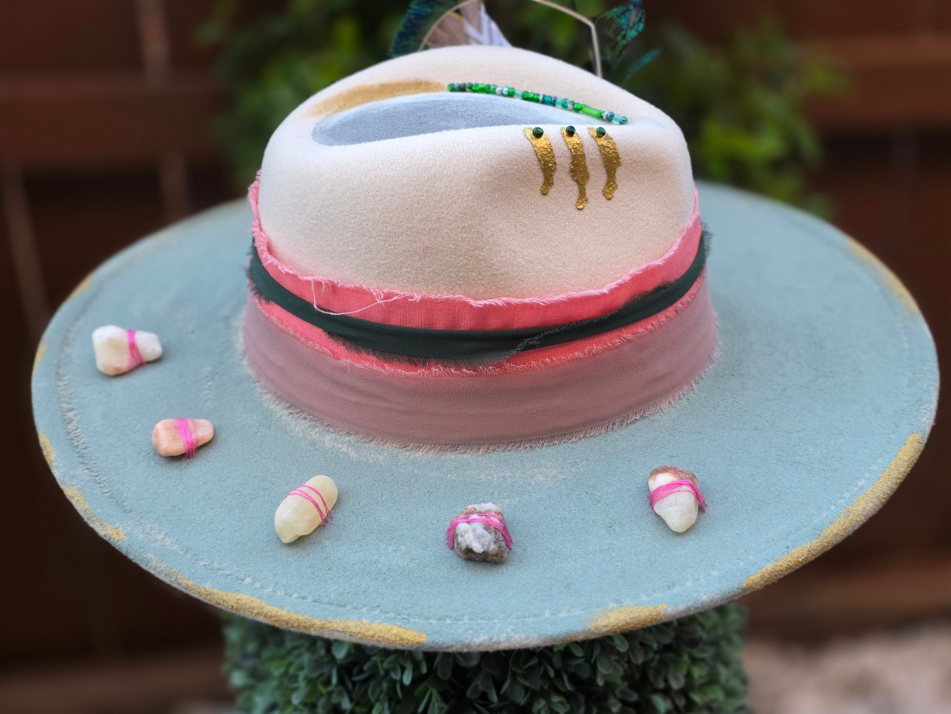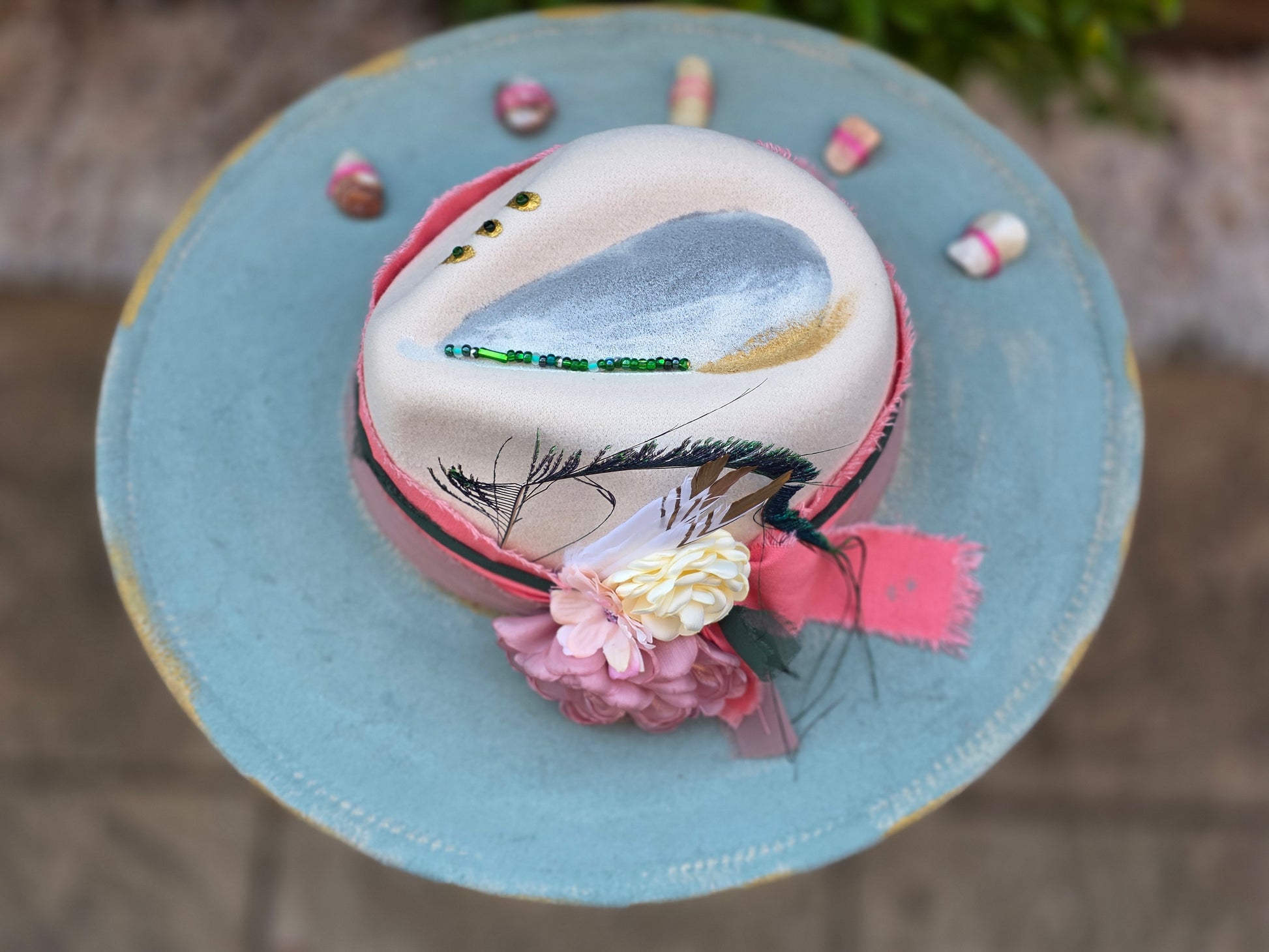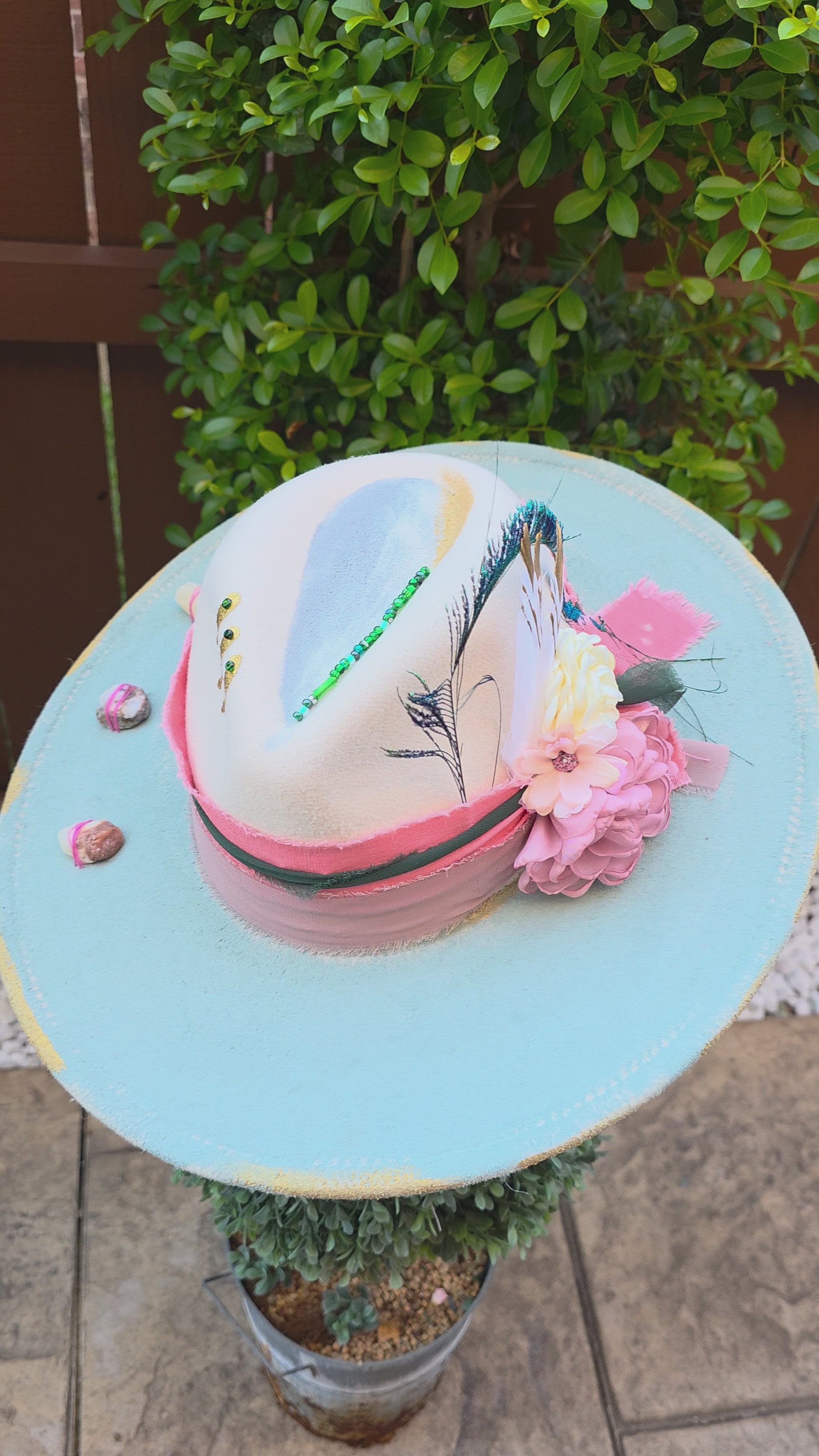 Hashtags: #HandmadeHat #ArtisticFedora #ImpressionistHat #WhimsicalStyle #FlairAndBrim #WearableArt #FestivalFashion #BohoChic #StatementHat