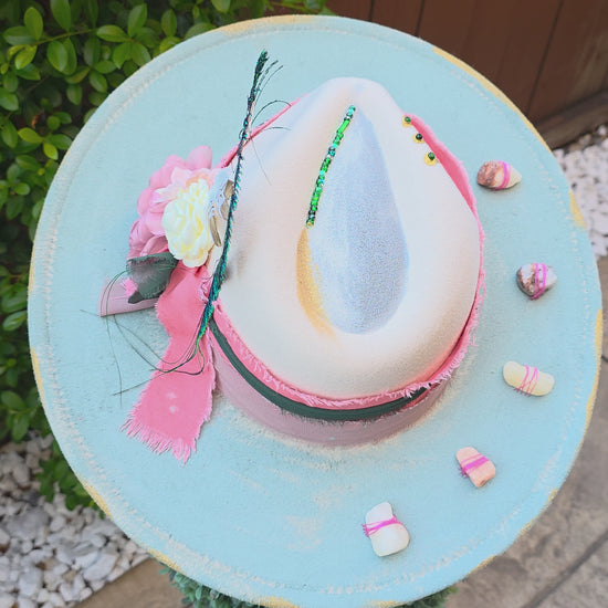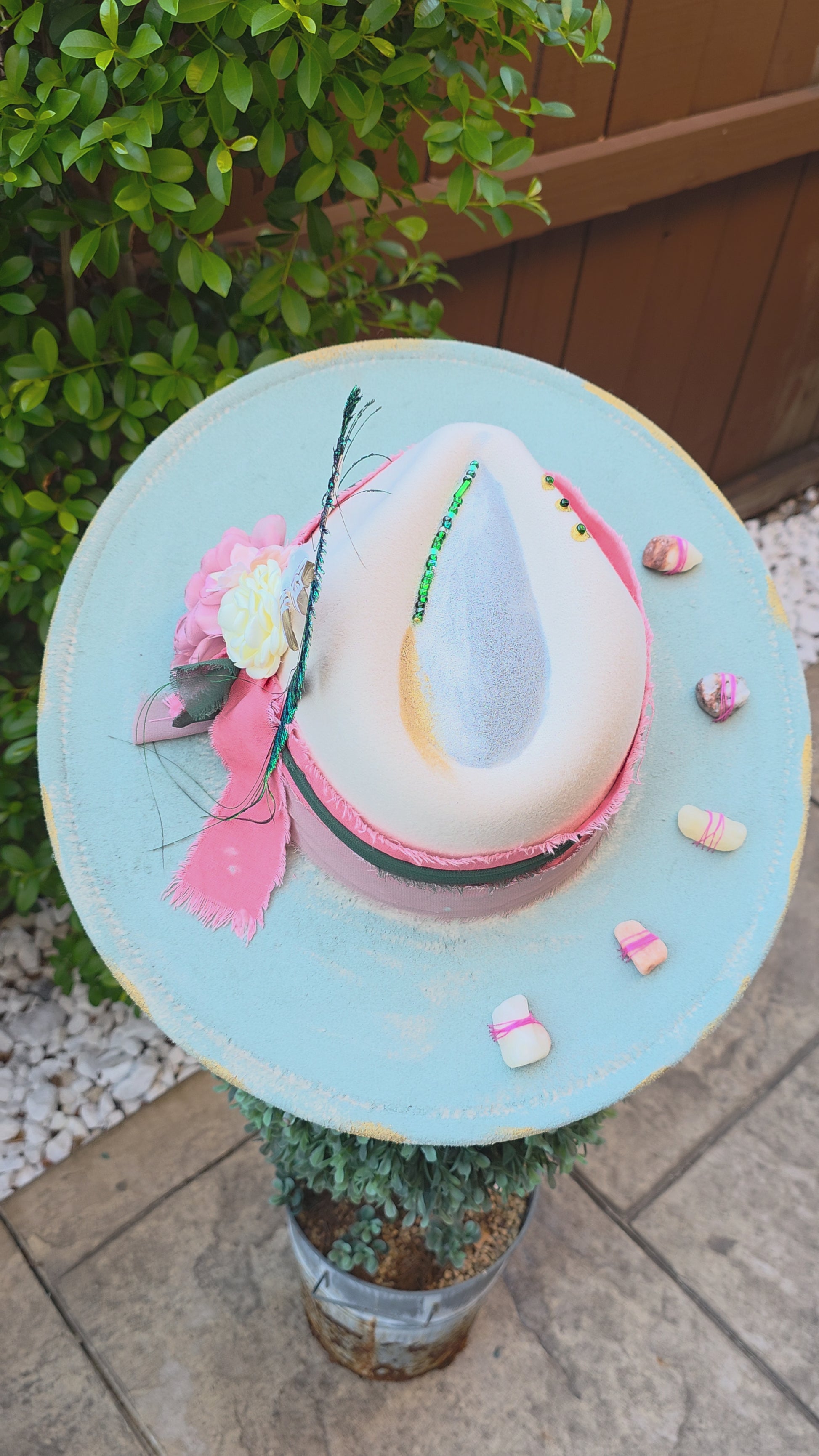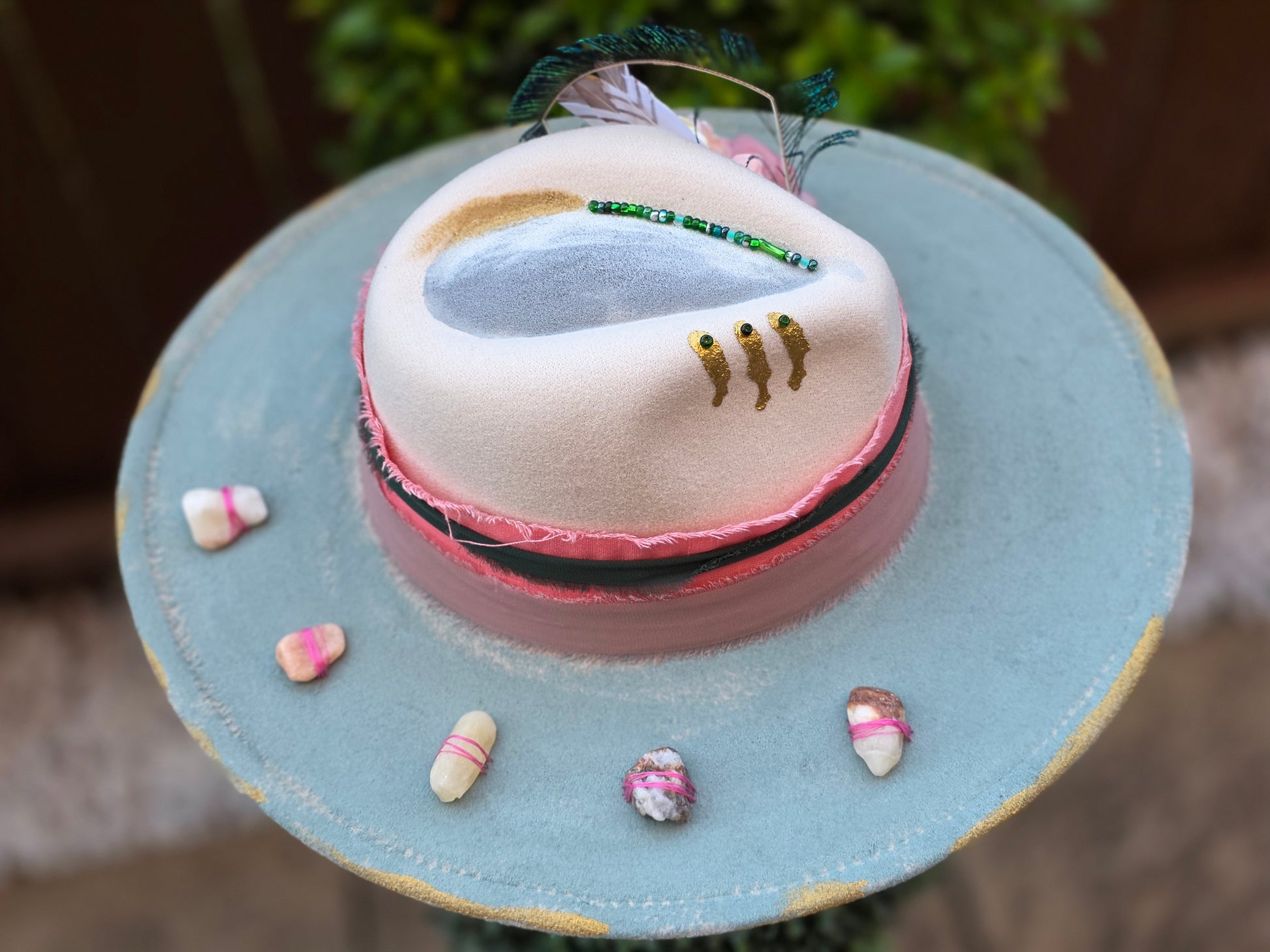 Step into a world of color and creativity with The Impressionist Dream Fedora, a handcrafted, mixed-media masterpiece that transforms a simple accessory into wearable art. Each hat is meticulously designed with a light blue brim and cream-colored crown, featuring hand-painted abstract and impressionist-inspired designs, including subtle facial elements and expressive linework accented with soft blues and shimmering gold.