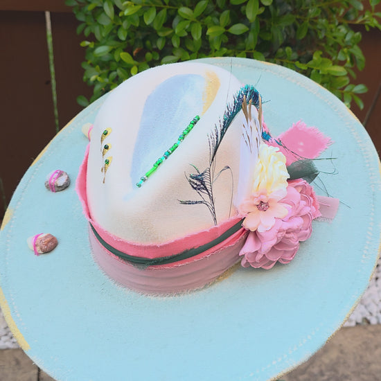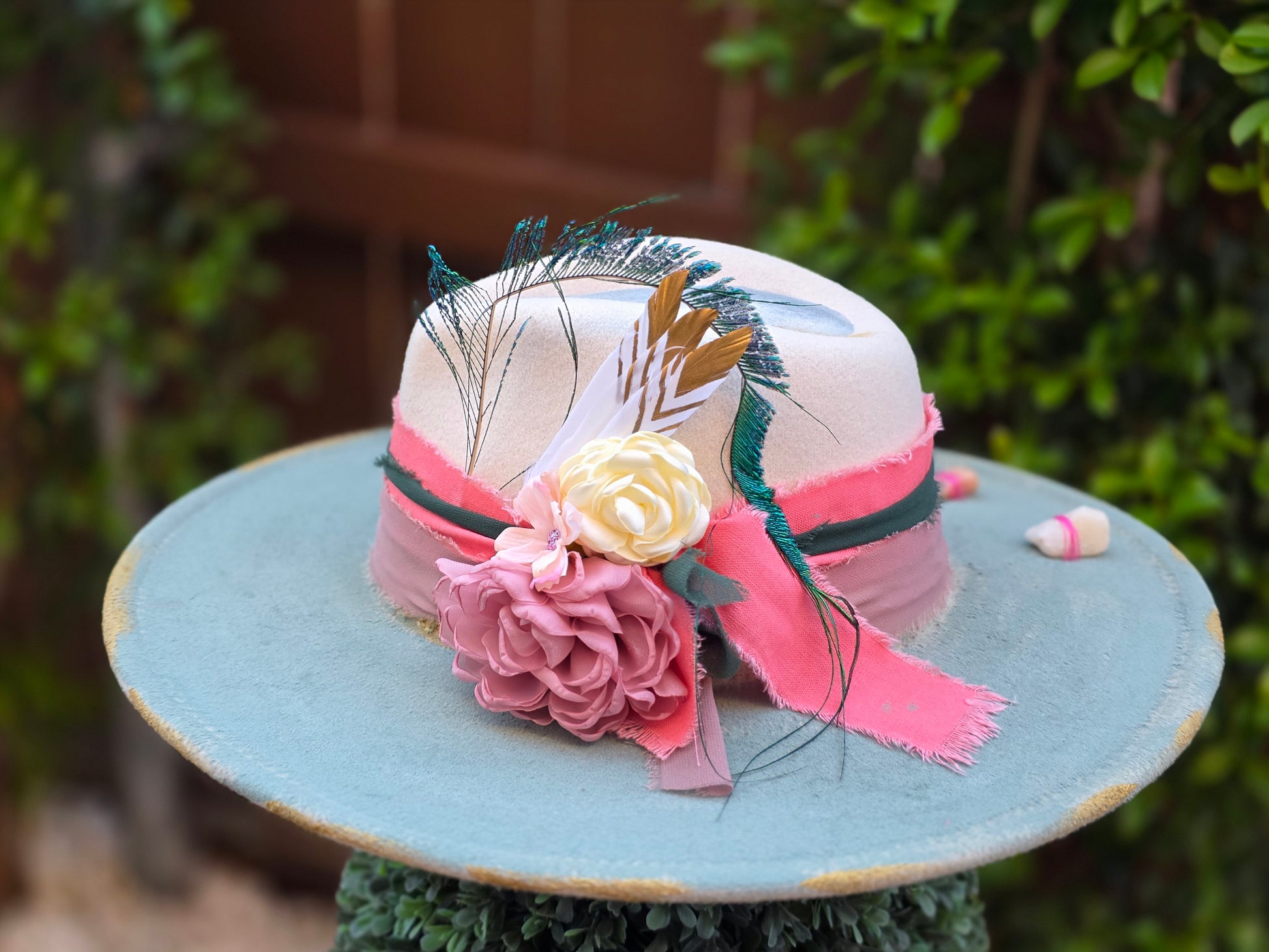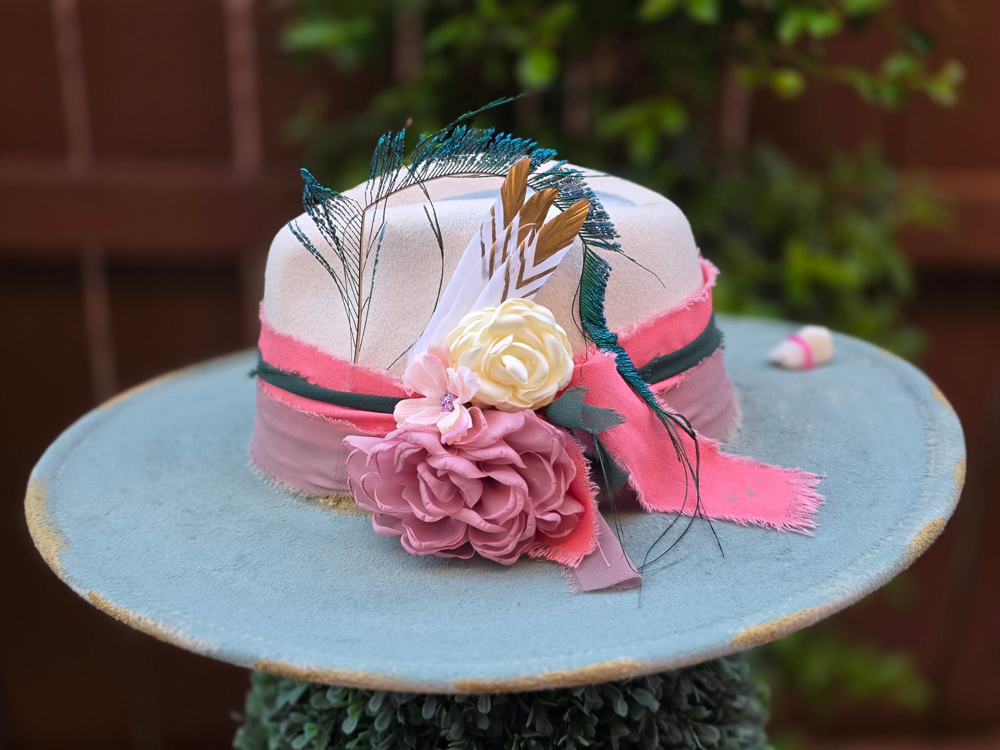 A pink ribbon wraps the crown, adding a playful contrast, while clusters of silk flowers, feathers, and ribbons bring dimension and whimsy. The brim is further decorated with pastel-colored embellishments, including cylindrical and round accents, creating a lively and artistic composition that draws the eye.