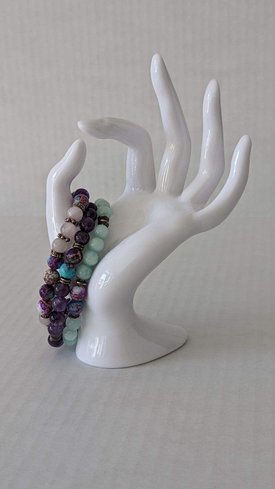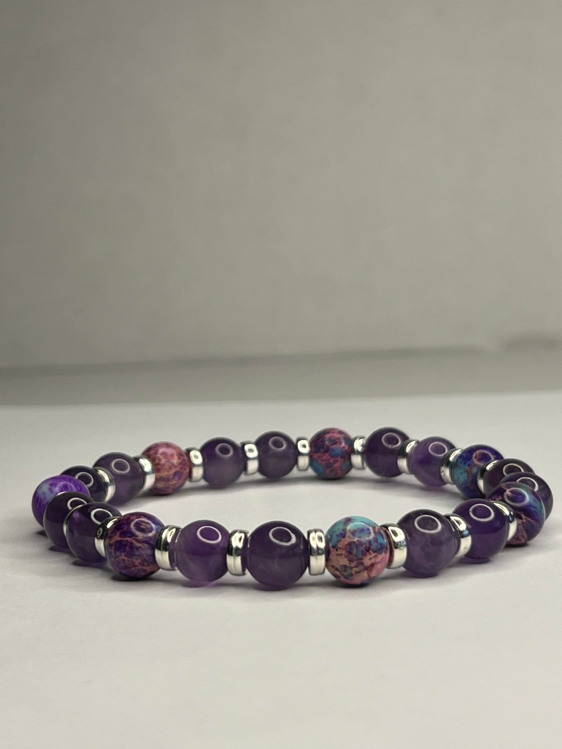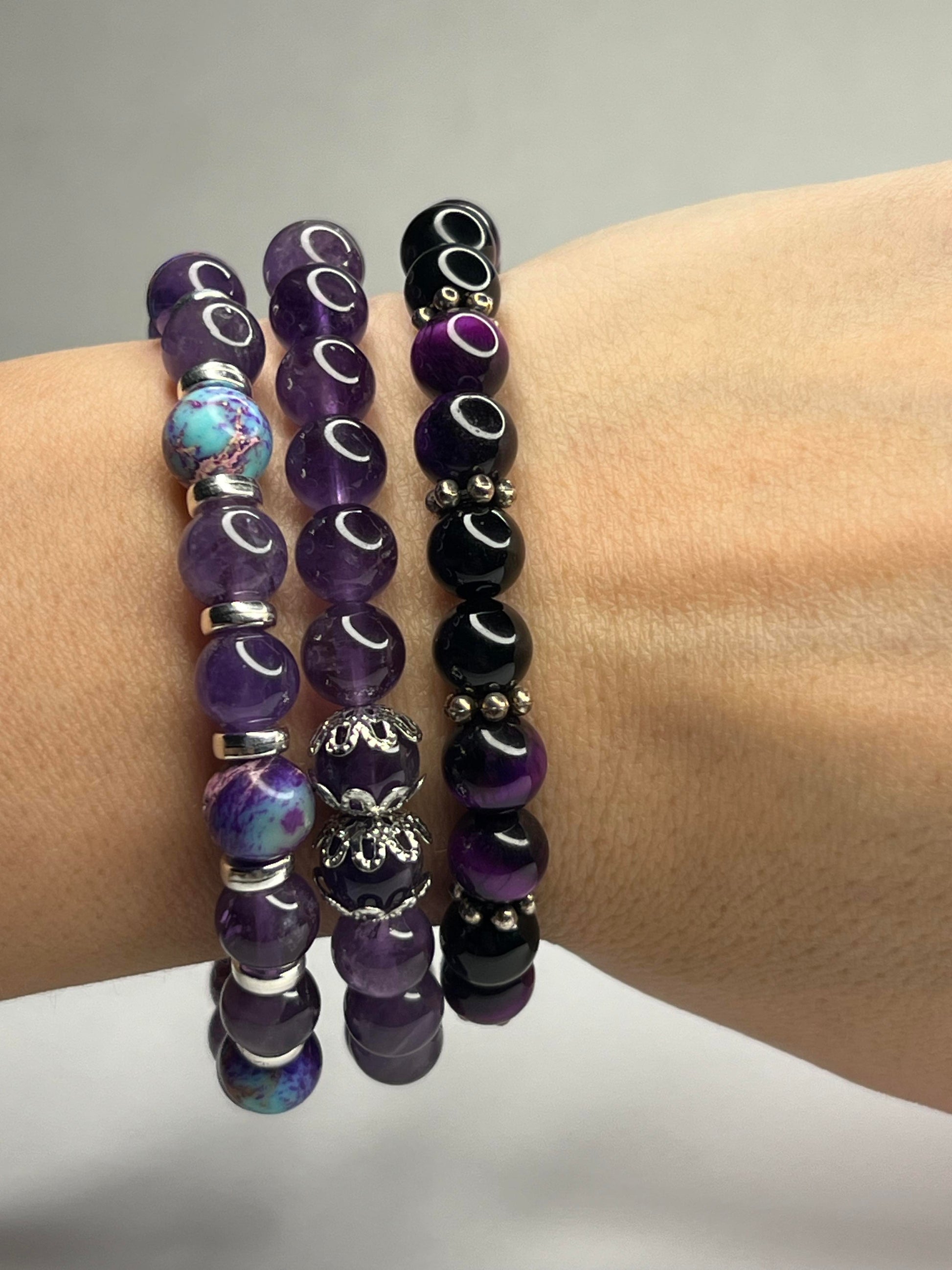 Combining purple tourmaline and amethyst with silver steel creates a striking piece that merges the protective and healing properties of amethyst with the balancing and cleansing energies of purple tourmaline. The addition of silver steel not only adds a modern aesthetic but also enhances the overall durability and elegance of the piece, making it a sophisticated choice for those drawn to the spiritual and physical benefits of these gemstones.