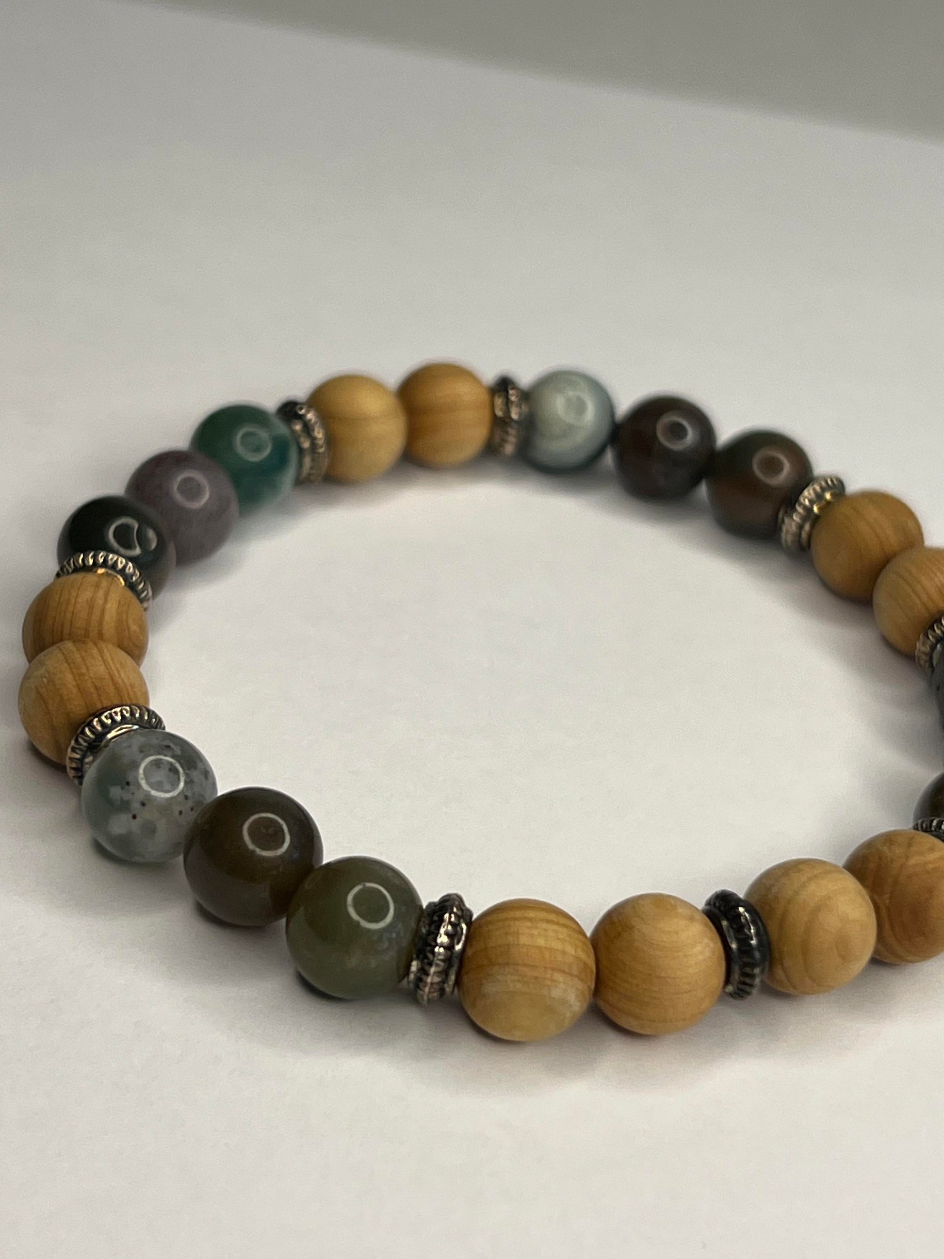 Combining Jasper with wood and steel crafts an accessory that merges the stabilizing and grounding energies of Jasper with the natural warmth of wood and the modern durability of steel. This blend not only offers a visually appealing contrast but also symbolizes a balance between the earth's grounding force, organic growth, and human innovation. It's an ideal choice for those who appreciate the healing properties of gemstones, the organic beauty of wood, and the strength and resilience symbolized by steel, making for a piece that's both aesthetically pleasing and meaningful.
