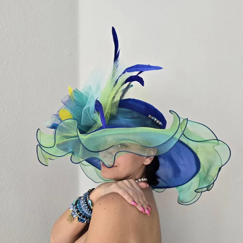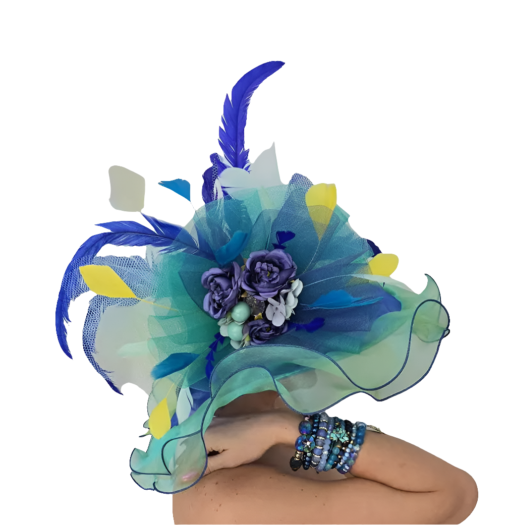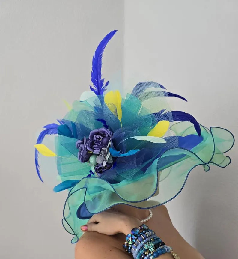 A Kentucky Derby hat featuring blue and green tones for women combines vibrant hues with the elegance of high-fashion, creating a stunning and eye-catching accessory. This type of hat would evoke a sense of freshness and natural beauty, often seen as a bold yet sophisticated choice for the event. Here’s a description of such a hat