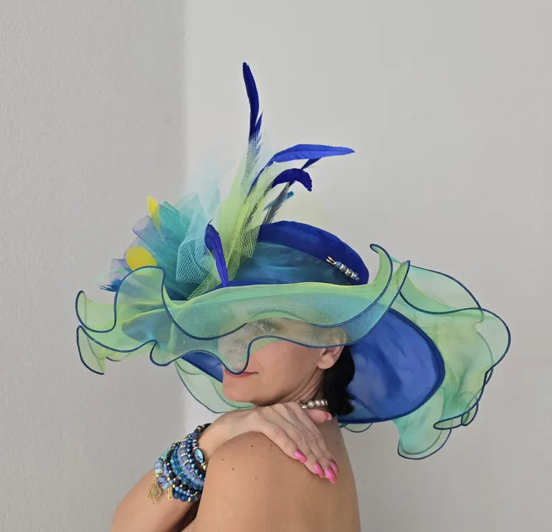 A blue and green Kentucky Derby hat with feathers would embody both natural beauty and extravagant fashion, perfect for a woman who wants to make a statement while embracing the tradition of the Derby in an elegant and eye-catching way