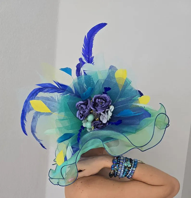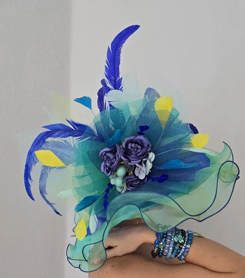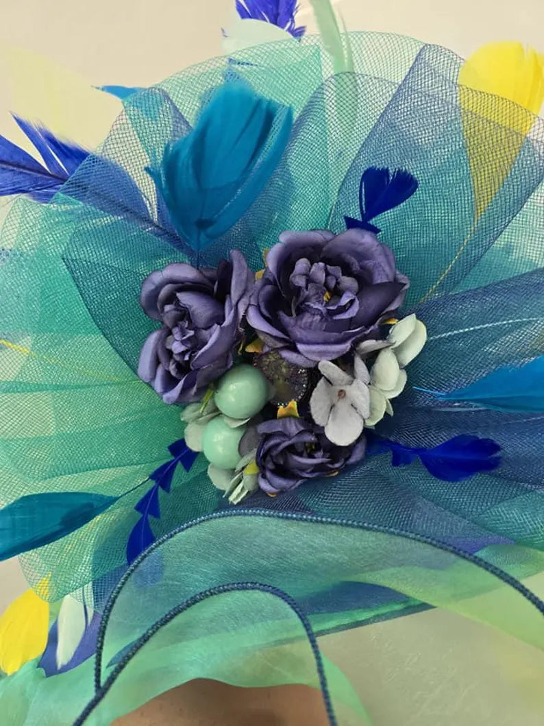 Feathers are a key feature of Kentucky Derby hats and would likely be used to add drama and movement. In this color scheme, you might find long, sweeping feathers in both blue and green, arranged to create texture and depth. These could be placed along the brim or clustered to one side, creating a dynamic, fluid shape that enhances the hat's sophistication.