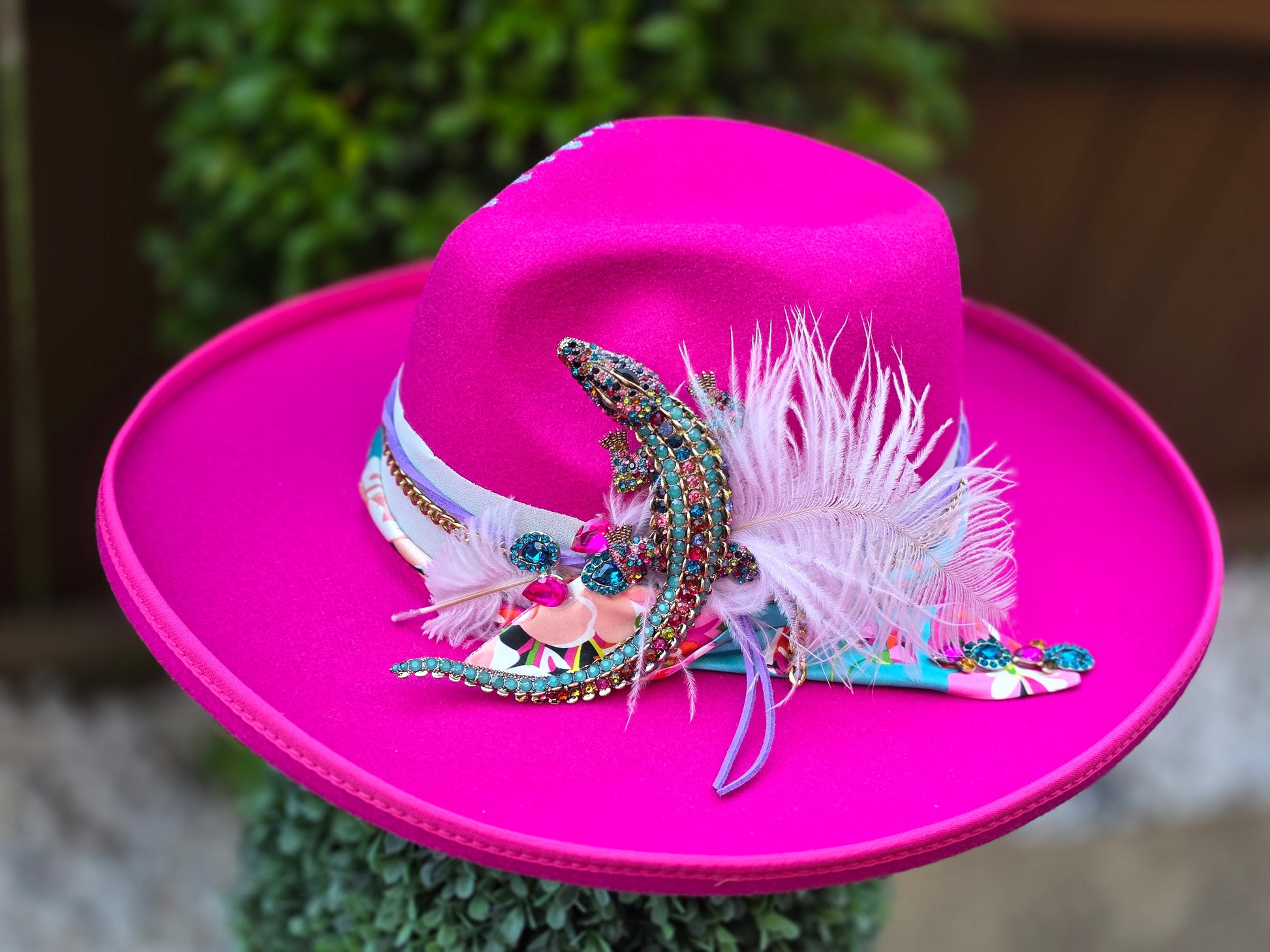 The centerpiece of this unique hat is a handcrafted jeweled lizard, adorned with sparkling rhinestones in turquoise, emerald, sapphire, and ruby. The lizard rests on a vibrant, patterned ribbon featuring intricate floral and abstract designs, while delicate white feathers and additional iridescent jewels with turquoise centers add texture, dimension, and a touch of luxury. Every element is carefully placed, making this fedora a true work of wearable art.