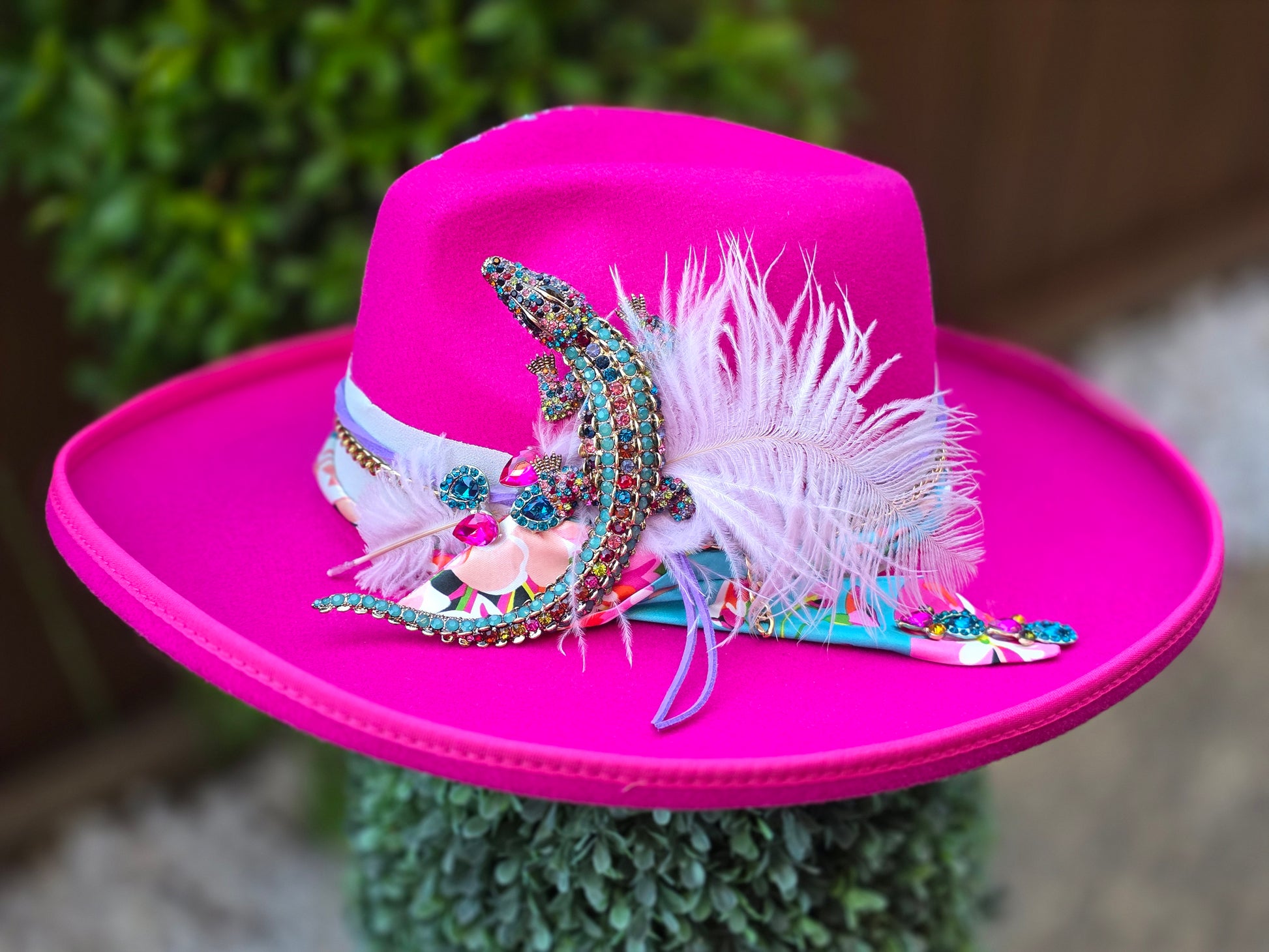 Fuchsia Fedora Hat with Jeweled Crocodile & Feather Embellishments – Handmade Luxury Statement Hat