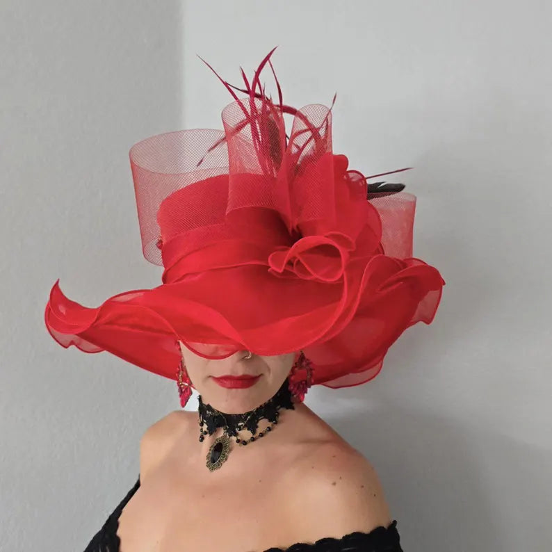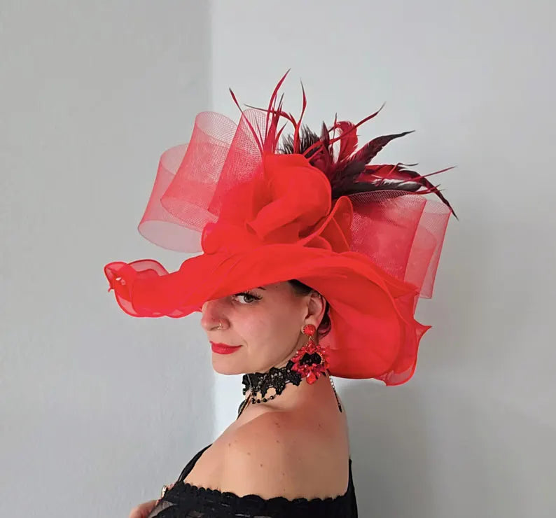A red Kentucky Derby hat for women is a striking and elegant accessory, often designed to capture attention with its bold color and intricate detailing. Typically crafted from lightweight materials such as organza or sinamay, this hat features a wide brim that provides a dramatic and sophisticated silhouette. The crown of the hat is adorned with embellishments like feathers, ribbons, flowers, and netting, adding a touch of flair and femininity. The deep, rich red hue evokes both energy and luxury, making it a perfect choice for a high-profile event like the Kentucky Derby, where fashion and individuality are celebrated. Whether paired with a chic dress or a tailored outfit, a red Kentucky Derby hat instantly elevates any ensemble with its timeless, yet modern, appeal.