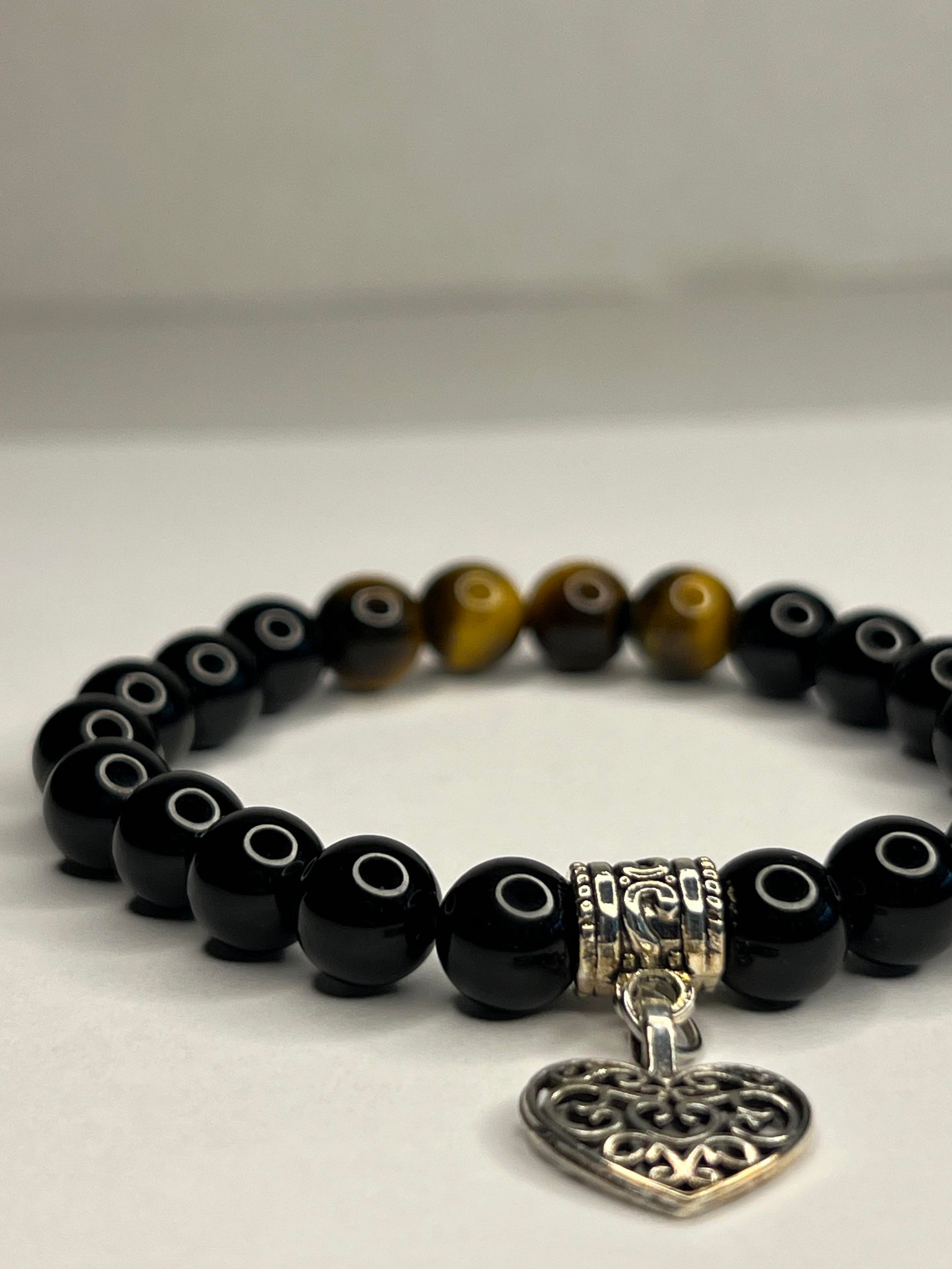 Yellow Tiger eye and Obsidian with steel Heart Charm