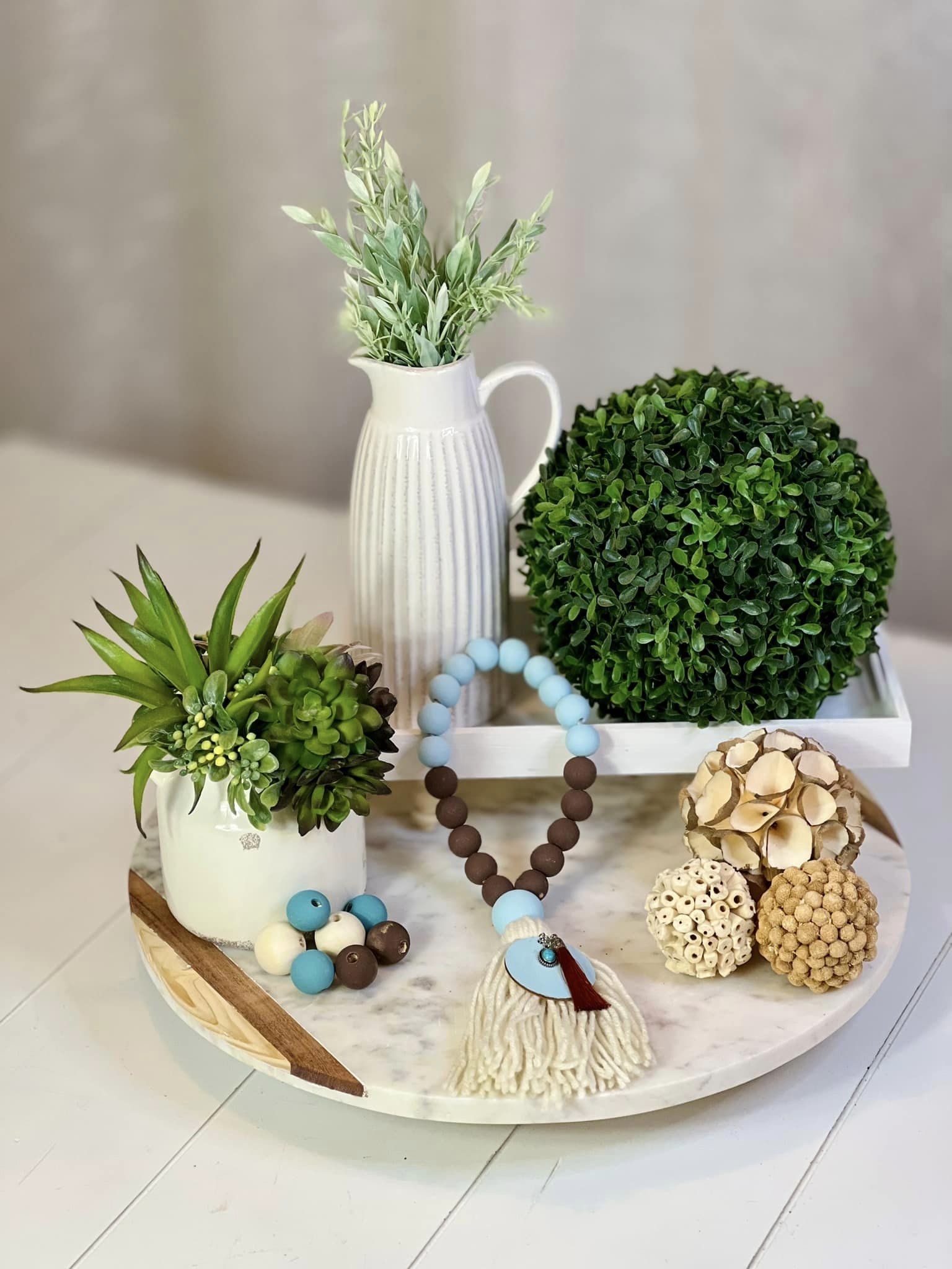 This hand-dyed wood bead garland makes a nice decorative accent and pop of color for your coffee table, bookshelf or decorative bowl. Round your flower vase, or just simply set on your table